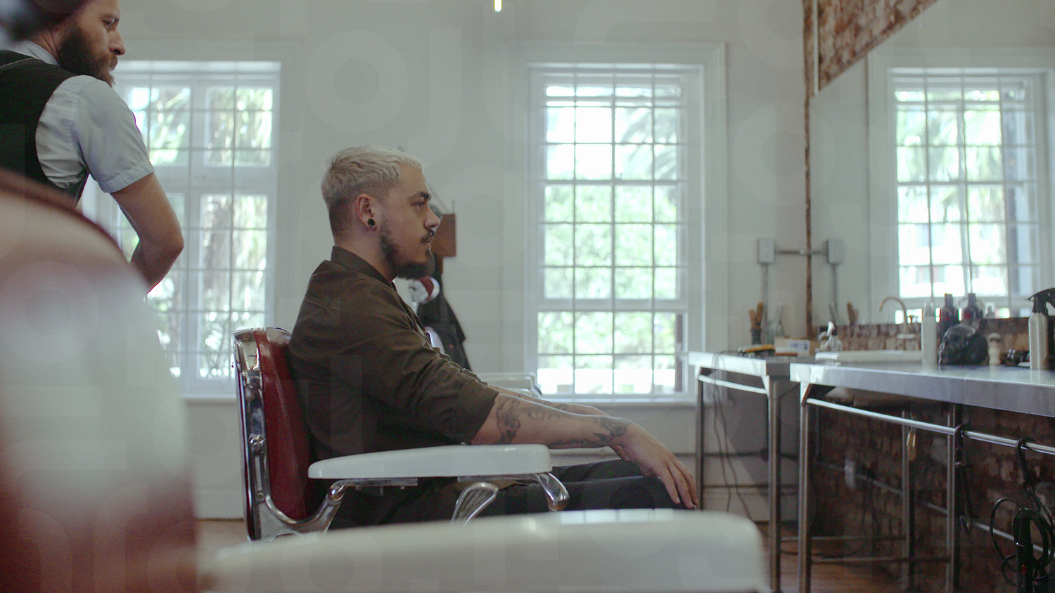 Hairdresser putting salon cape to customer before haircut. Male stylist at work with man sitting on chair.