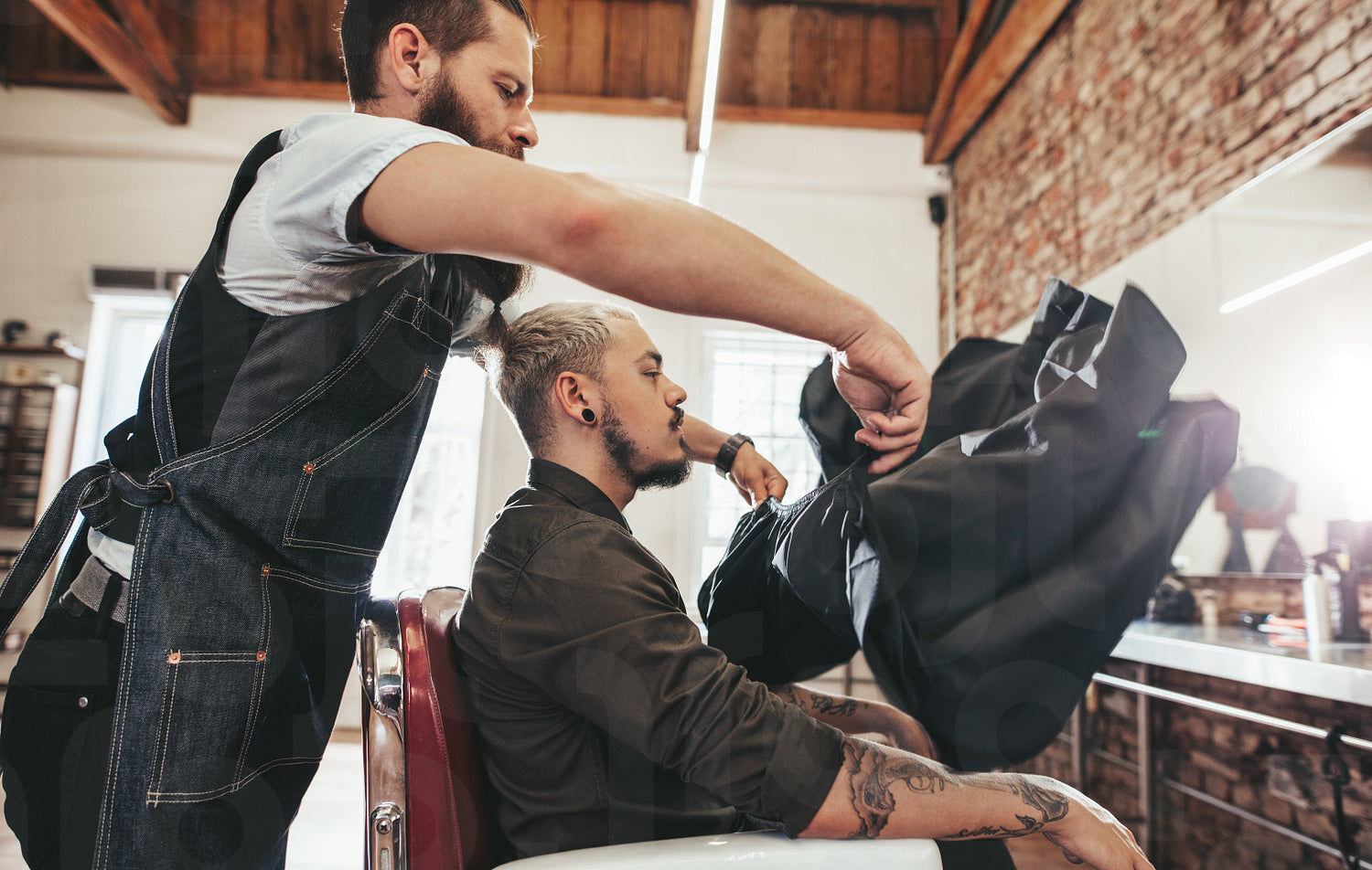 Barber putting salon cape to client. Male hairdresser at work with handsome man sitting on chair.