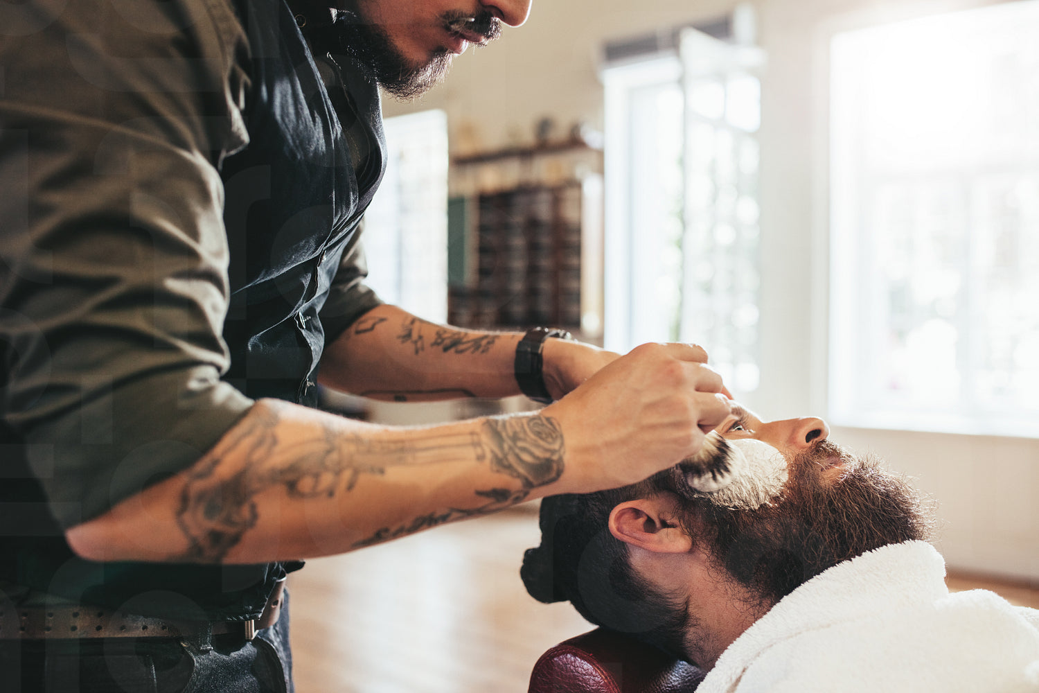 Professional barber holding brush and applying foam on the face of his client while going to shave. Hairdresser shaving customer in salon.