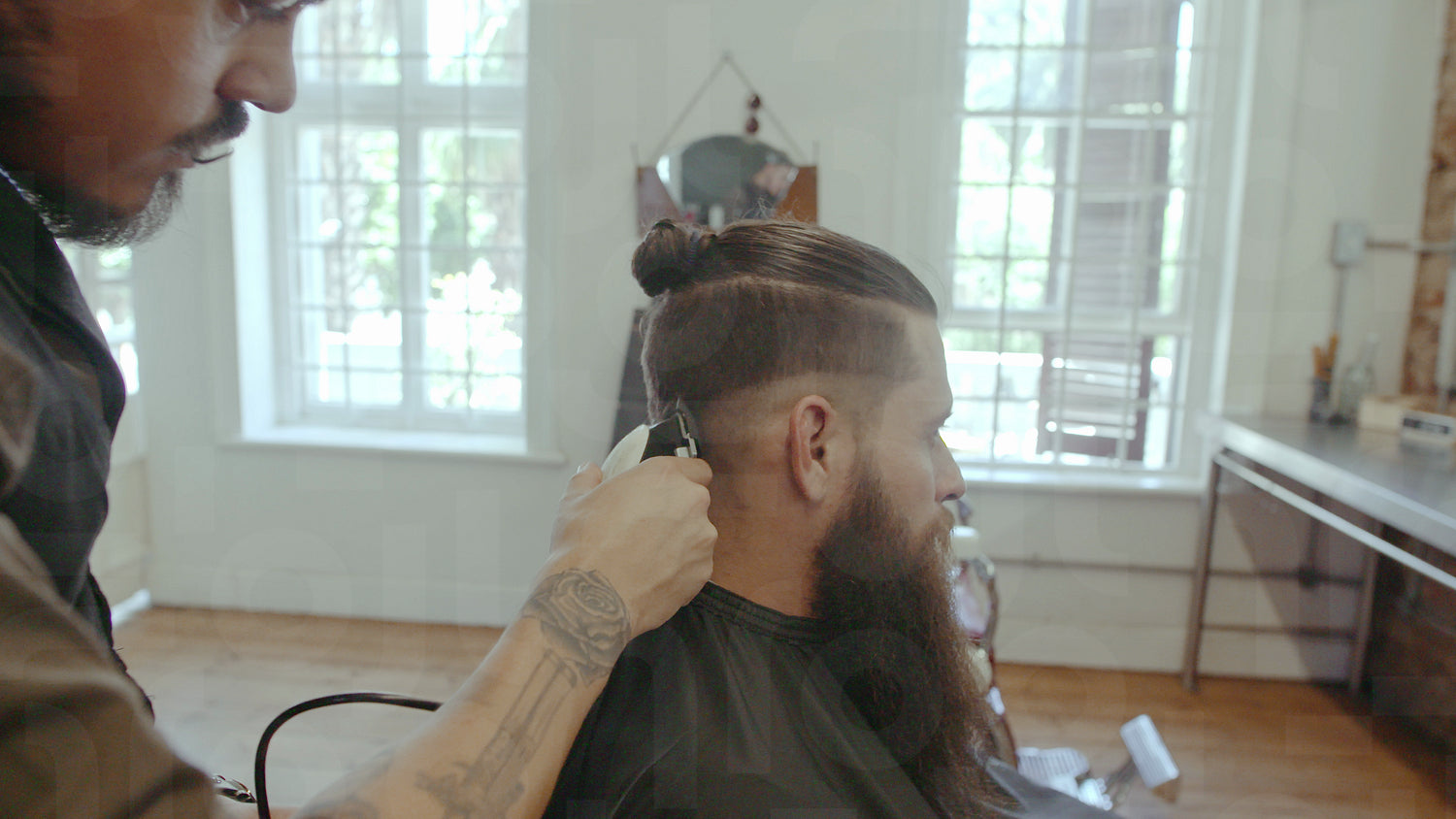 Hairstylist cutting hair of customer at barber shop. Man getting haircut at salon.