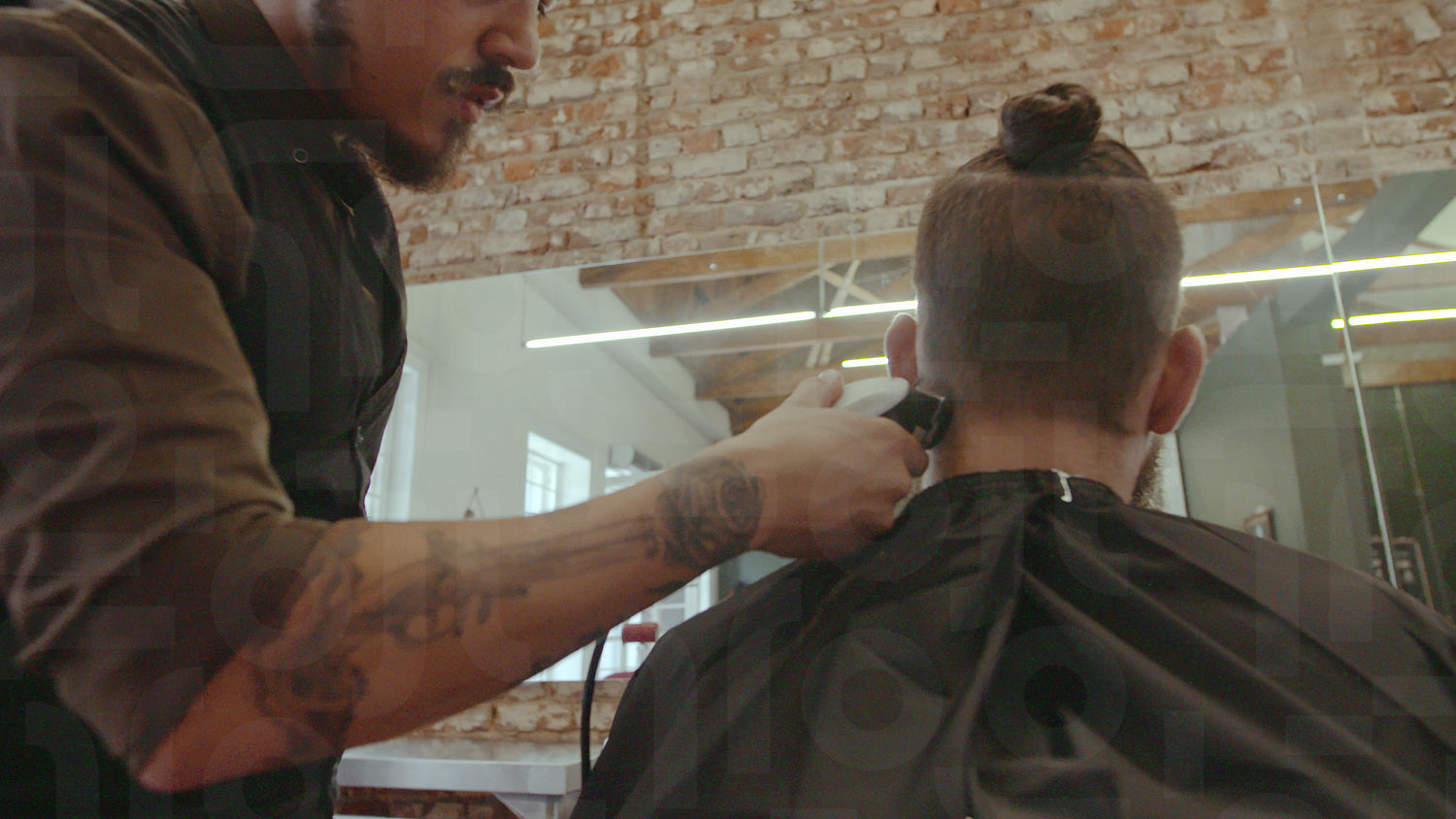 Hairstylist giving stylish haircut to client at barber shop. Barber cutting hair of customer with trimmer.