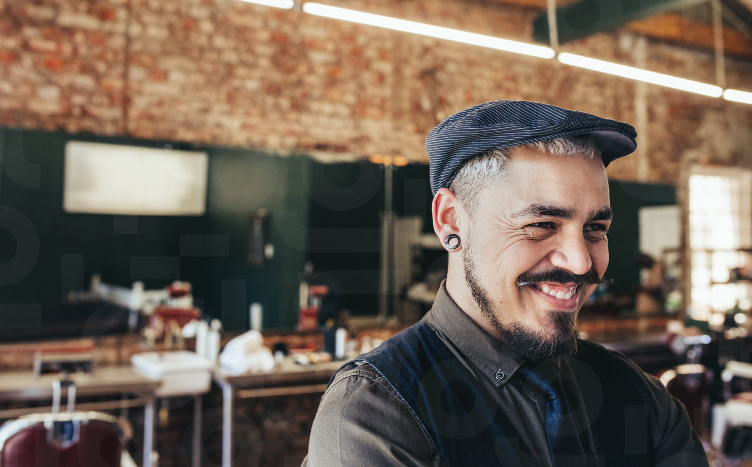 Close up of successful male barber with cap looking away and smiling. Handsome hairdresser in salon.