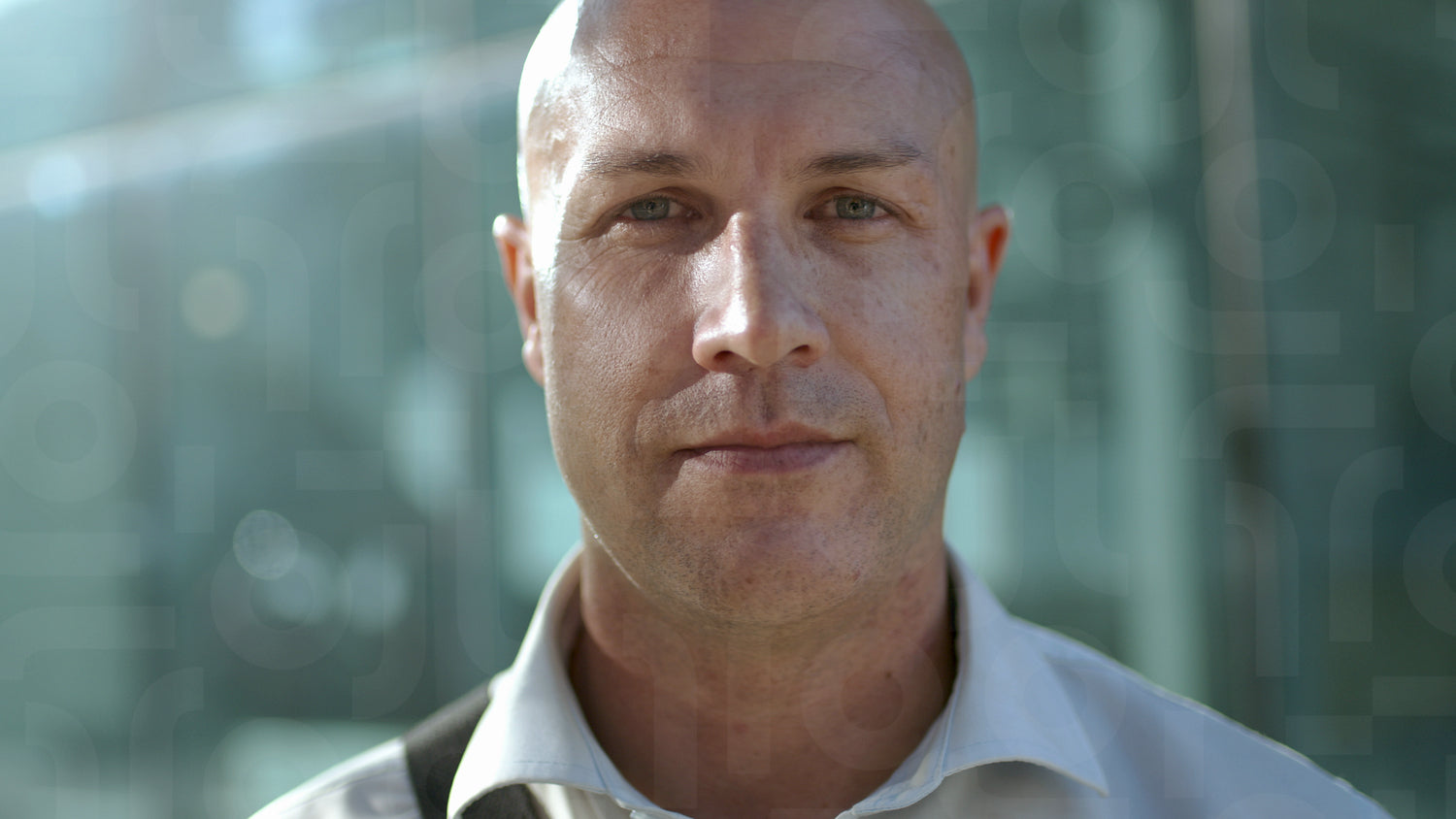 Portrait of a mature businessman staring at camera. Bald head man standing outdoors.