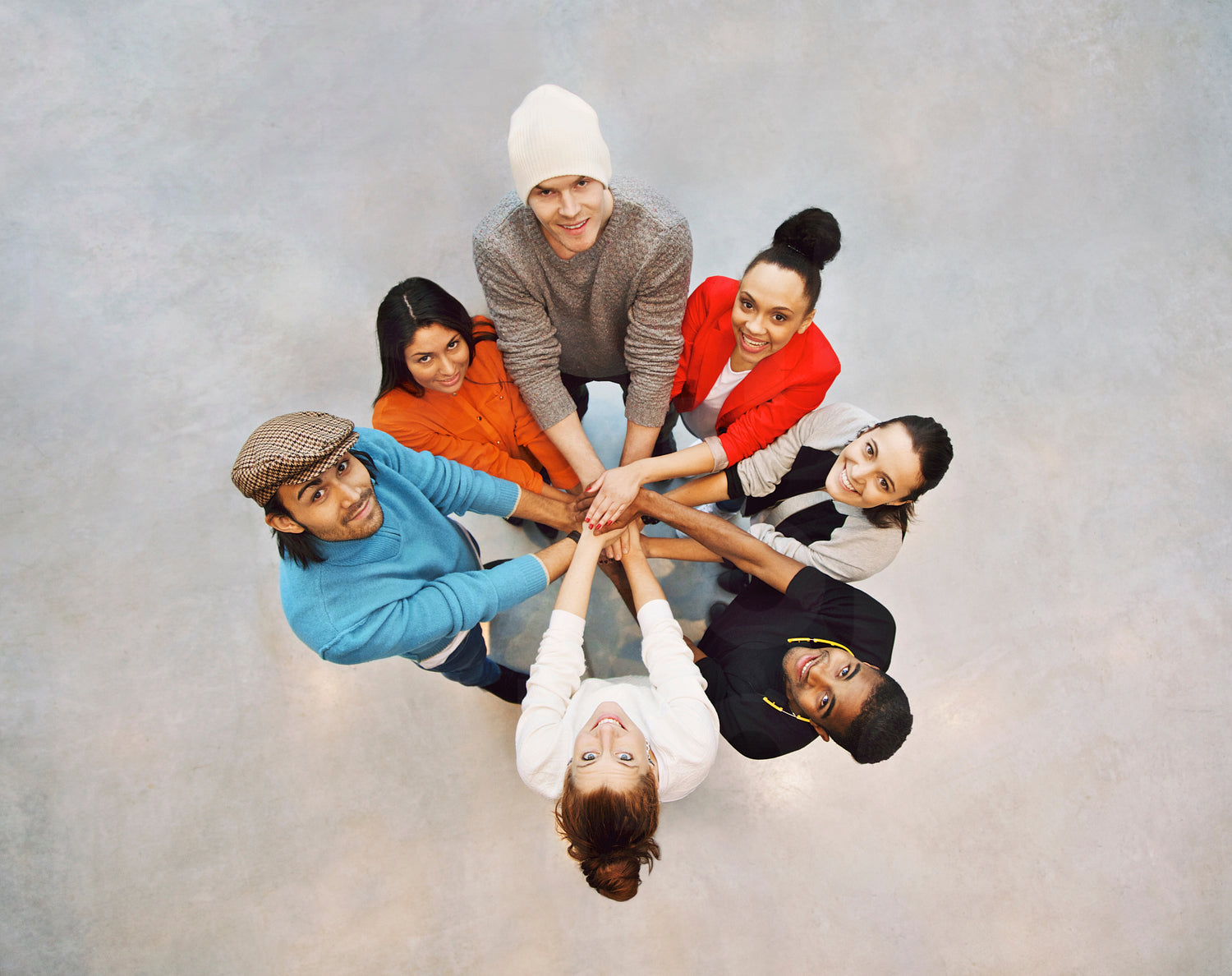 Group of happy young students showing. Top view of multiethnic group of young people putting their hands together. Young students standing in a circle making stack of hands showing unity as a team.