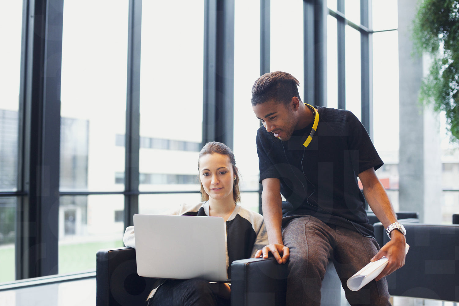 Young woman working on laptop with man sitting by on chair in university campus. College students using laptop for finding information for their studies.