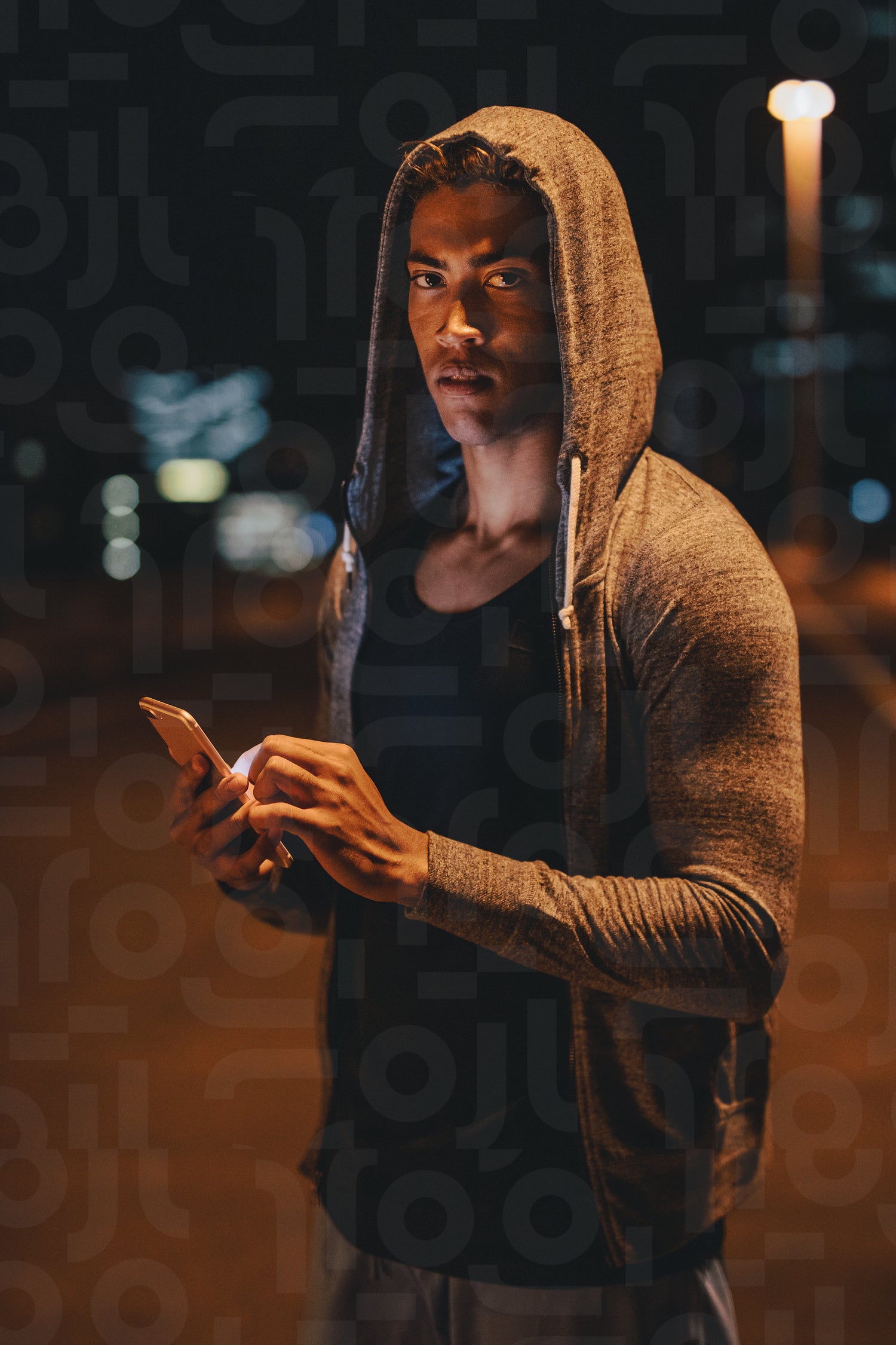 Fit young man in hooded shirt standing outdoors with mobile phone. Fitness man taking break after workout outdoors at night.