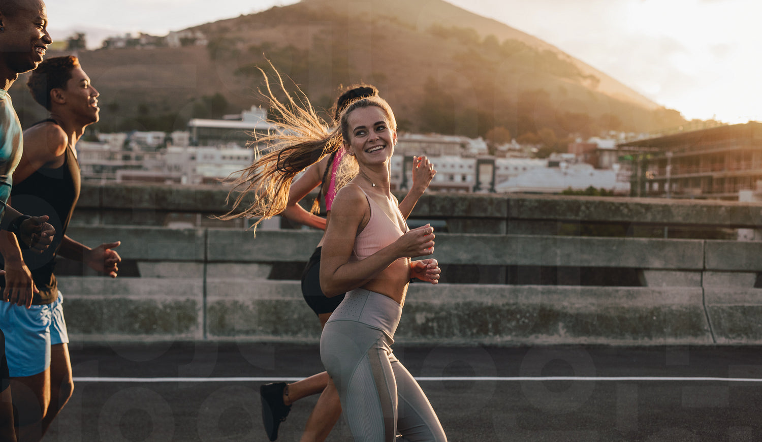 Fit young woman running with friends in the city. Runners training outdoors in morning.