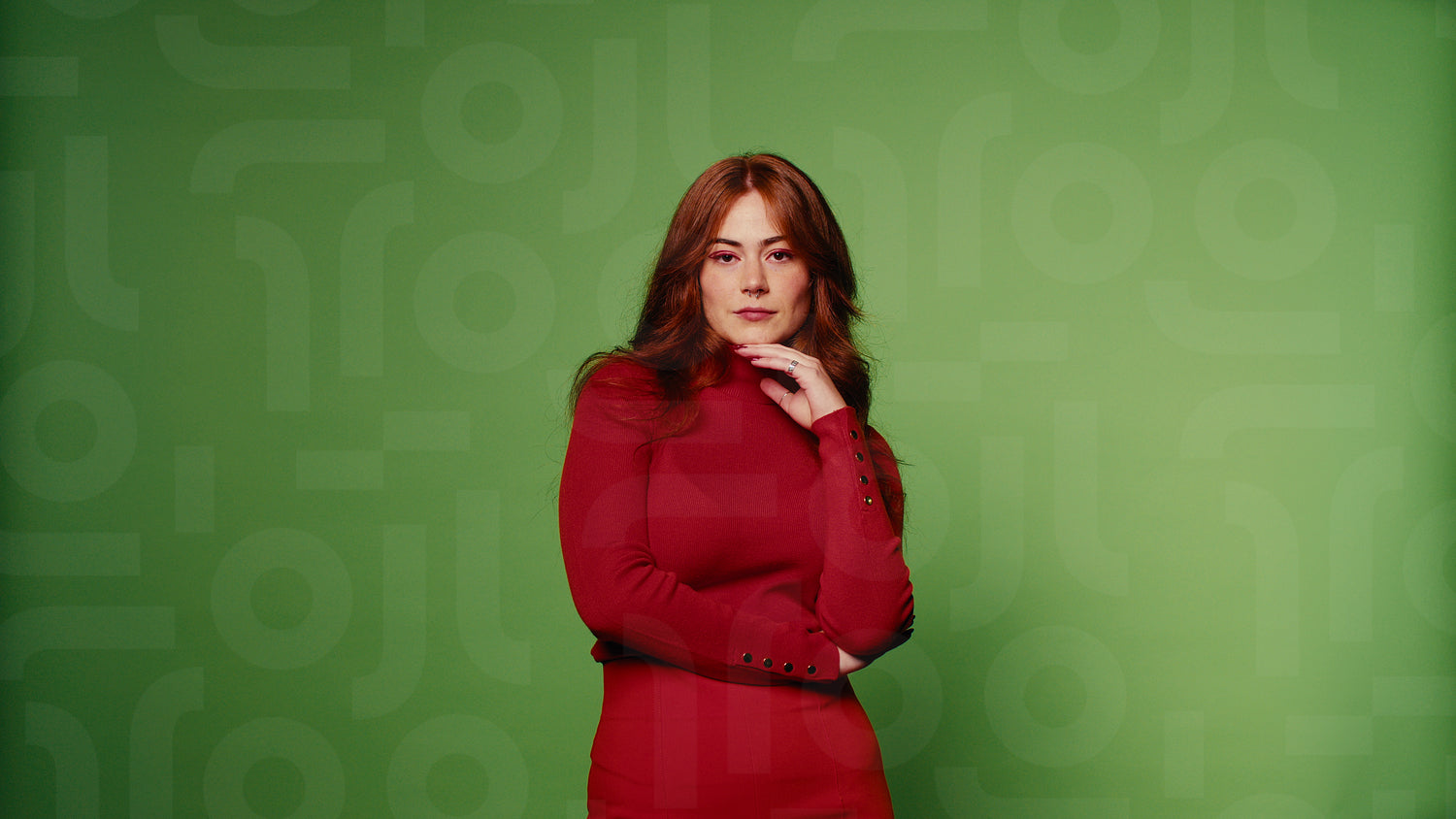 Beautiful woman with long red hair smiles and laughs in studio against green screen. Happy, joyful, content, green screen studio shoot.