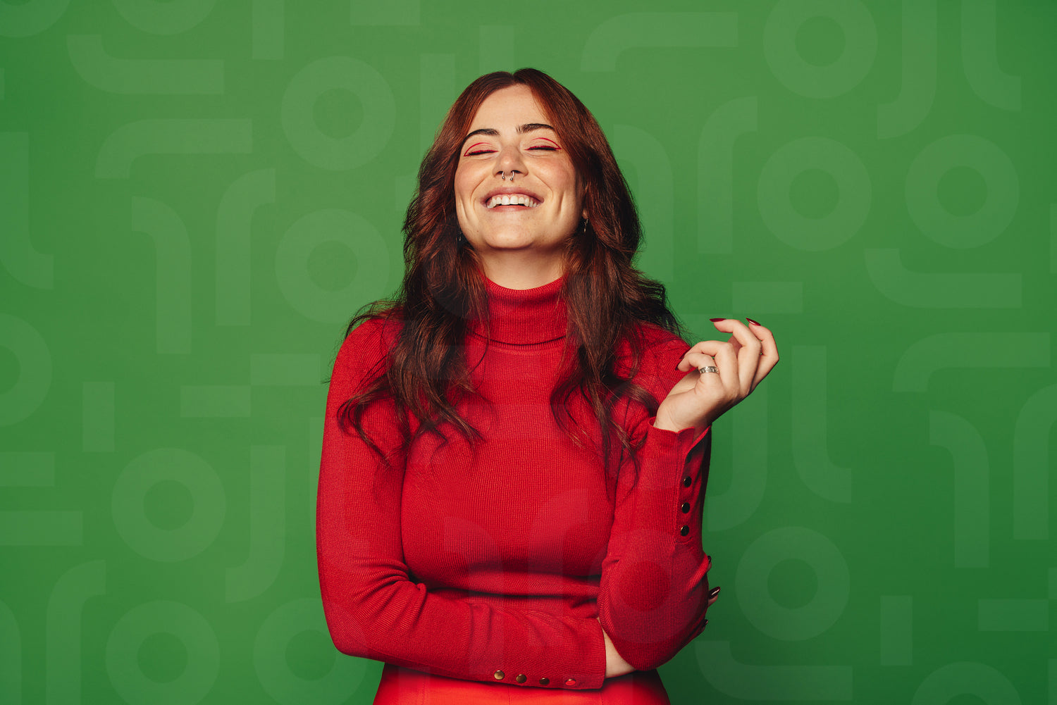 Confident and colorful, a young woman with casual clothing and trendy fashion stands against a vibrant green background. Her cheerful smile and nose ring add a touch of personality to her carefree and happy lifestyle.