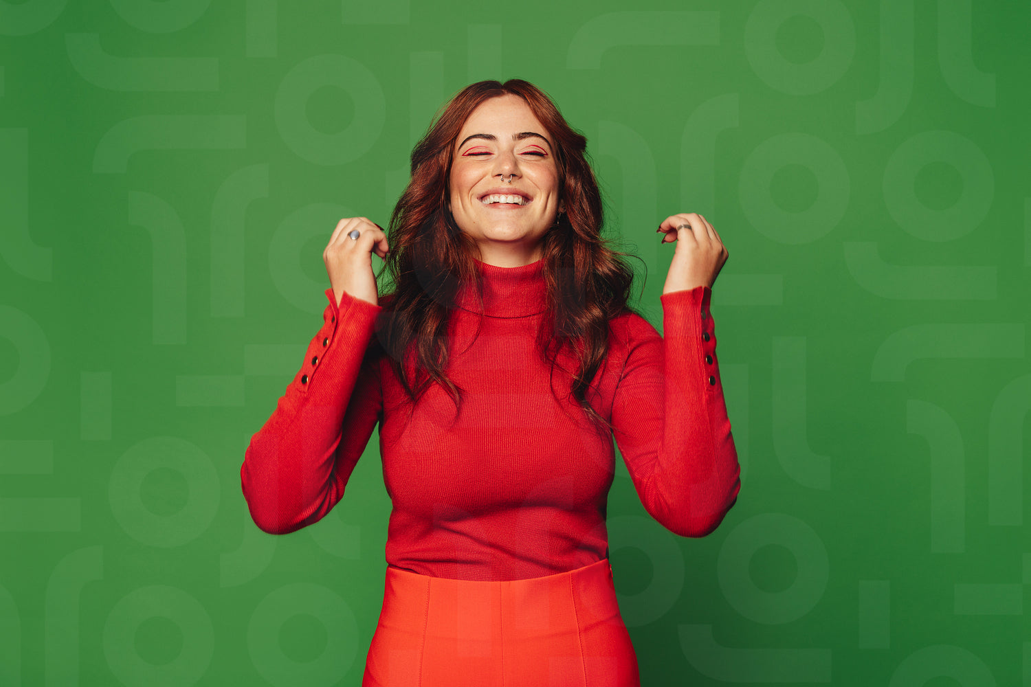 Portrait of a vibrant, cheerful woman standing confidently in a green studio with a trendy sweater and nose ring. Her joyful laughter and carefree lifestyle exude confidence and happiness.