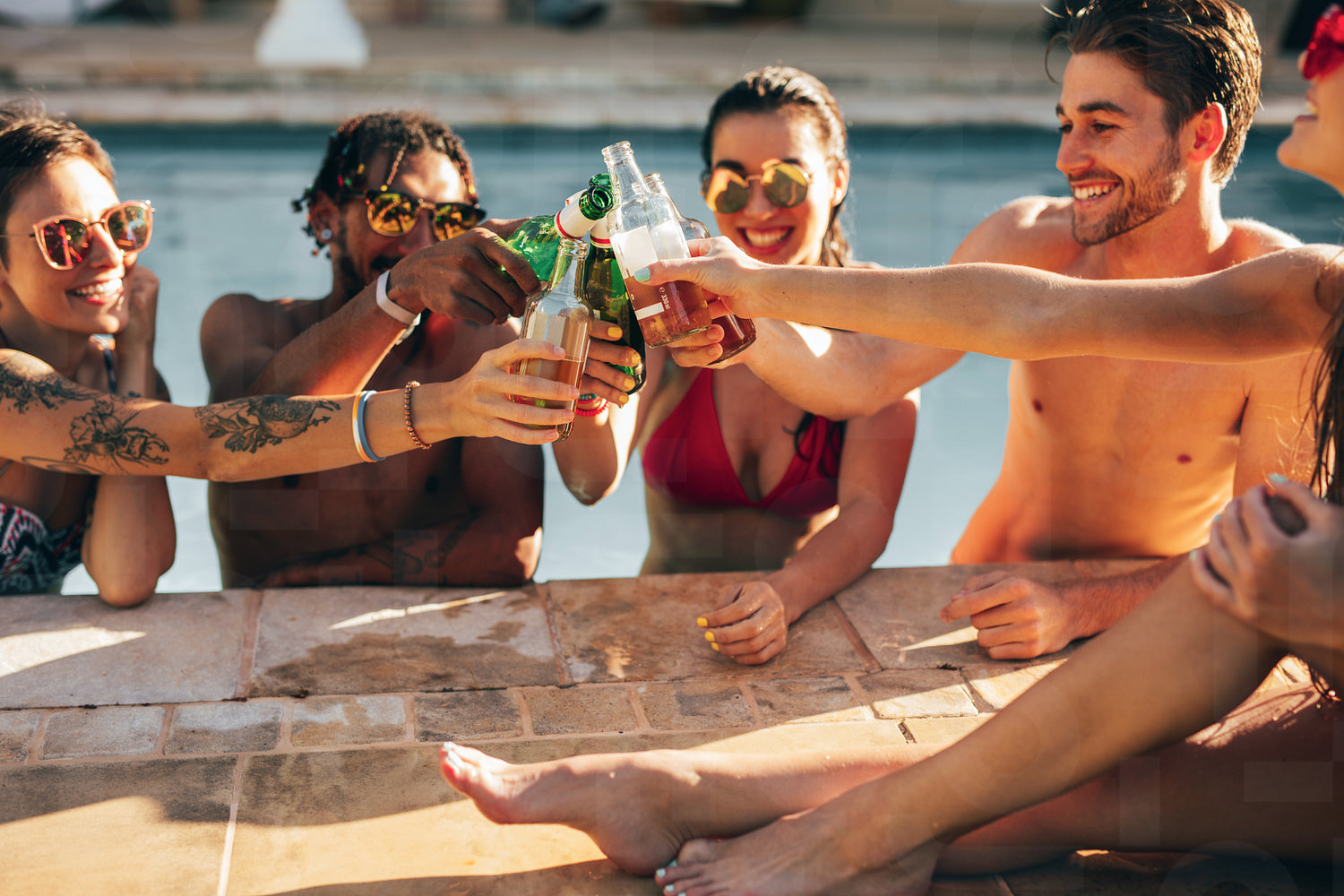Group of friends toasting with beer bottles in a pool party. Multi-ethnic men and women celebrating summer holidays.