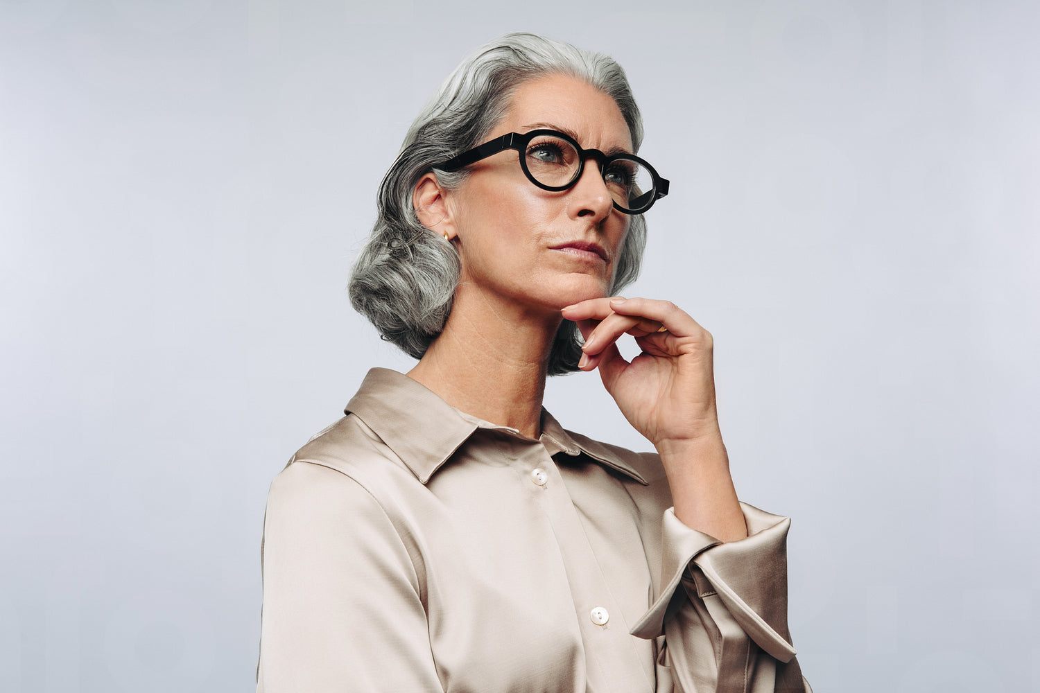 Mature professional woman in studio poses with hand on chin, wearing glasses and a blouse while gazing thoughtfully. Portrait conveys confidence, contemplation, experience and poised leadership for business concepts.