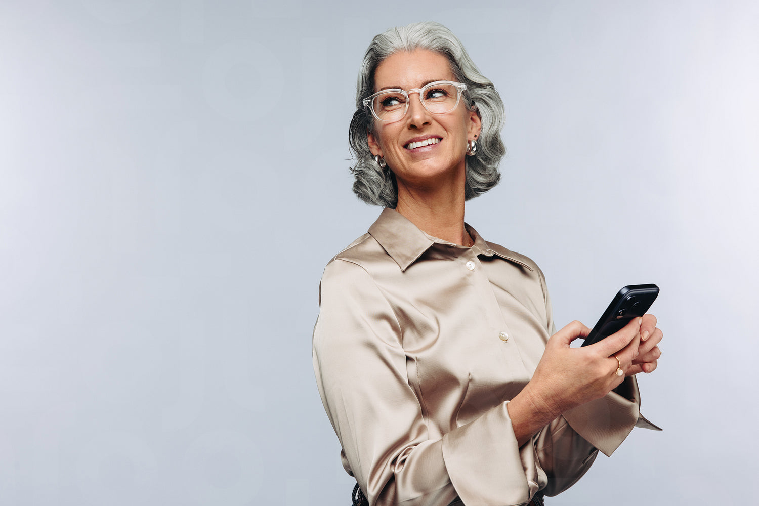 A confident mature businesswoman smiles as she checks her smartphone in a studio portrait, conveying professionalism, tech-savvy attitude and positive communication for corporate and lifestyle use.