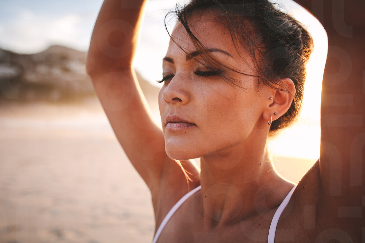 Close up of fit woman sitting on beach with eyes closed. Female meditating at the beach.