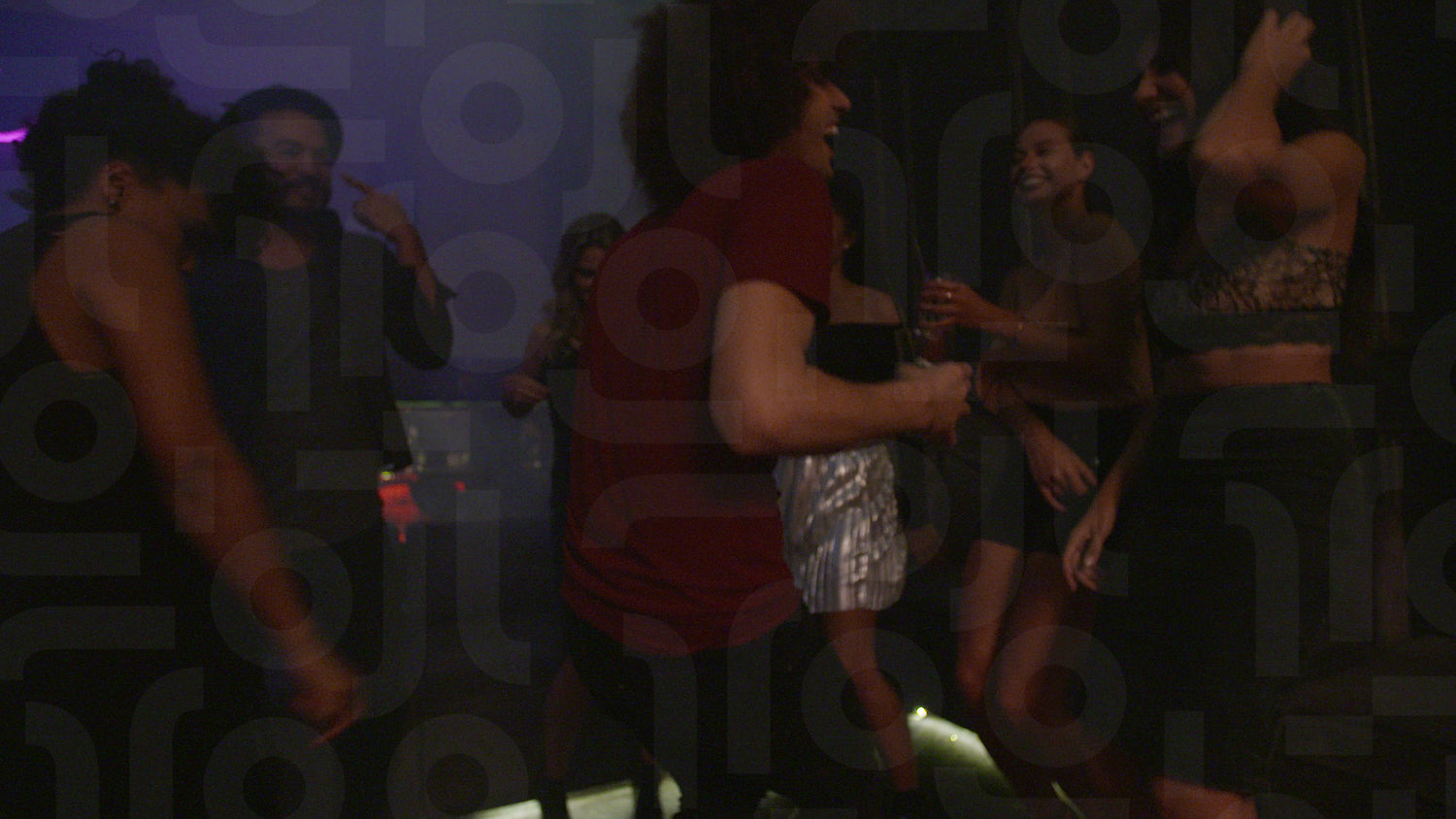 Happy young people dancing and partying at nightclub. Group of friends enjoying at bar with drinks.