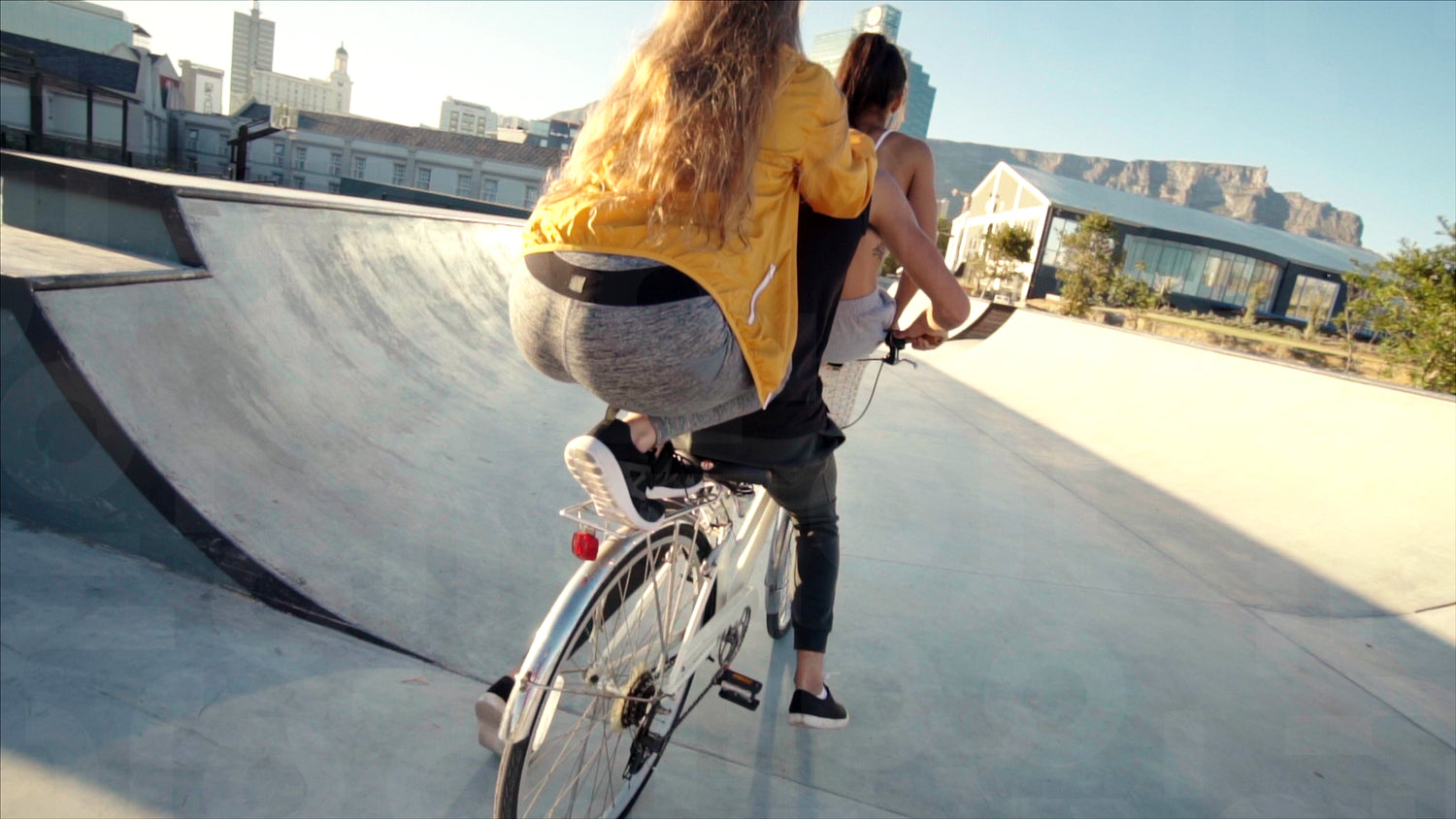 Group of playful friends laughing and having fun while riding a bicycle together in an urban skate park. Three happy young people hanging out together on a sunny weekend.