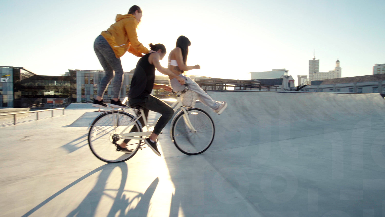 Three playful friends having fun while riding a bicycle together in an urban skate park. Group of happy young people hanging out together on a sunny weekend.