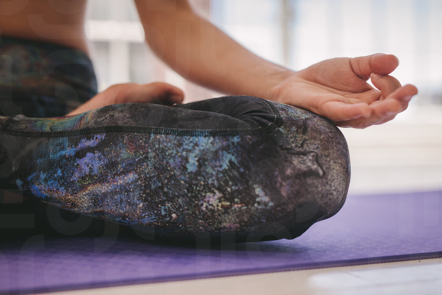 Female in yoga class sitting on exercise mat with legs crossed and hands on knees. Woman meditating in Padmasana yoga pose at class. Cropped shot with focus on hand.