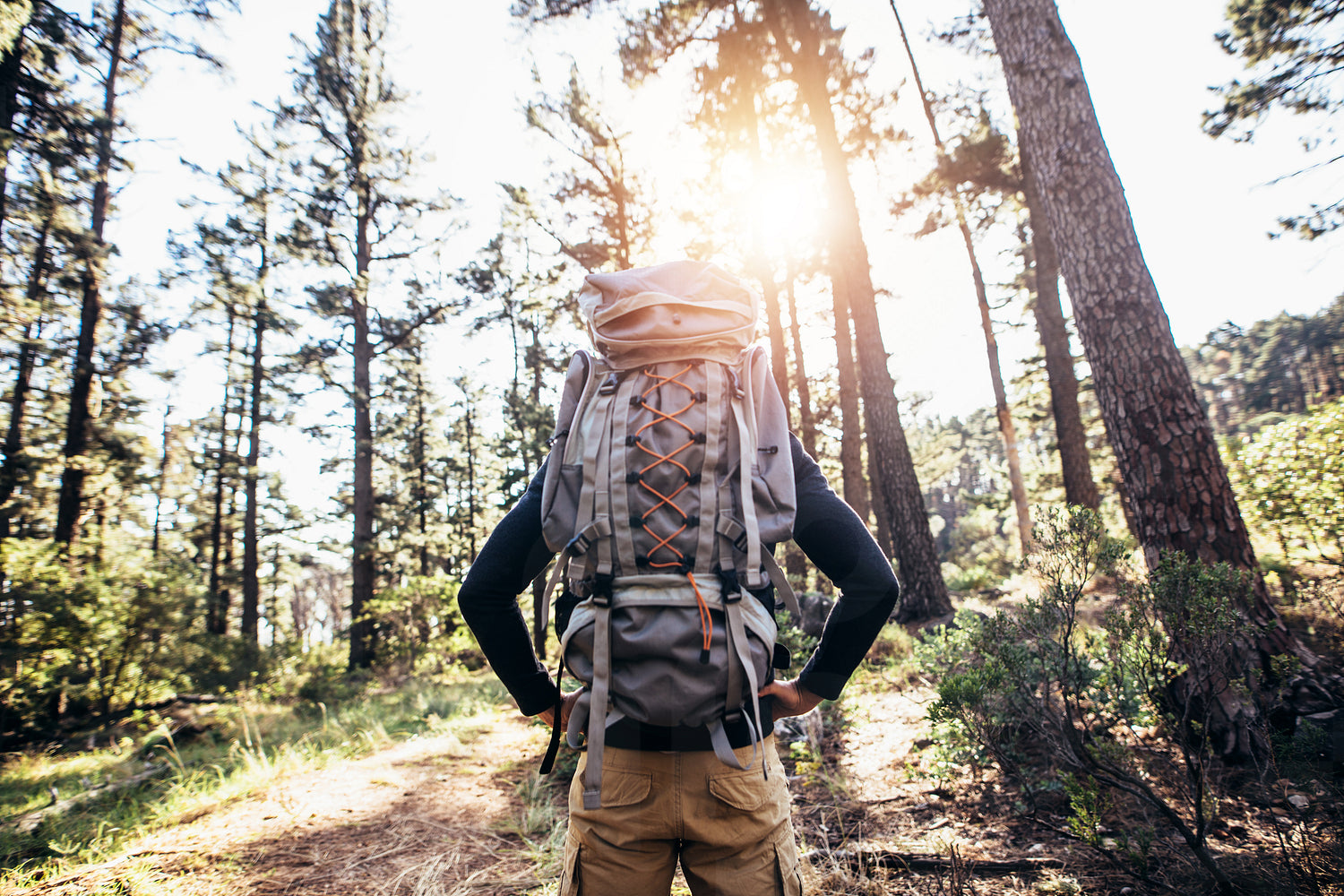 Man wearing a hiker backpack walking on forest trail. Rear view of a man trekking in forest carrying an adventure bag.