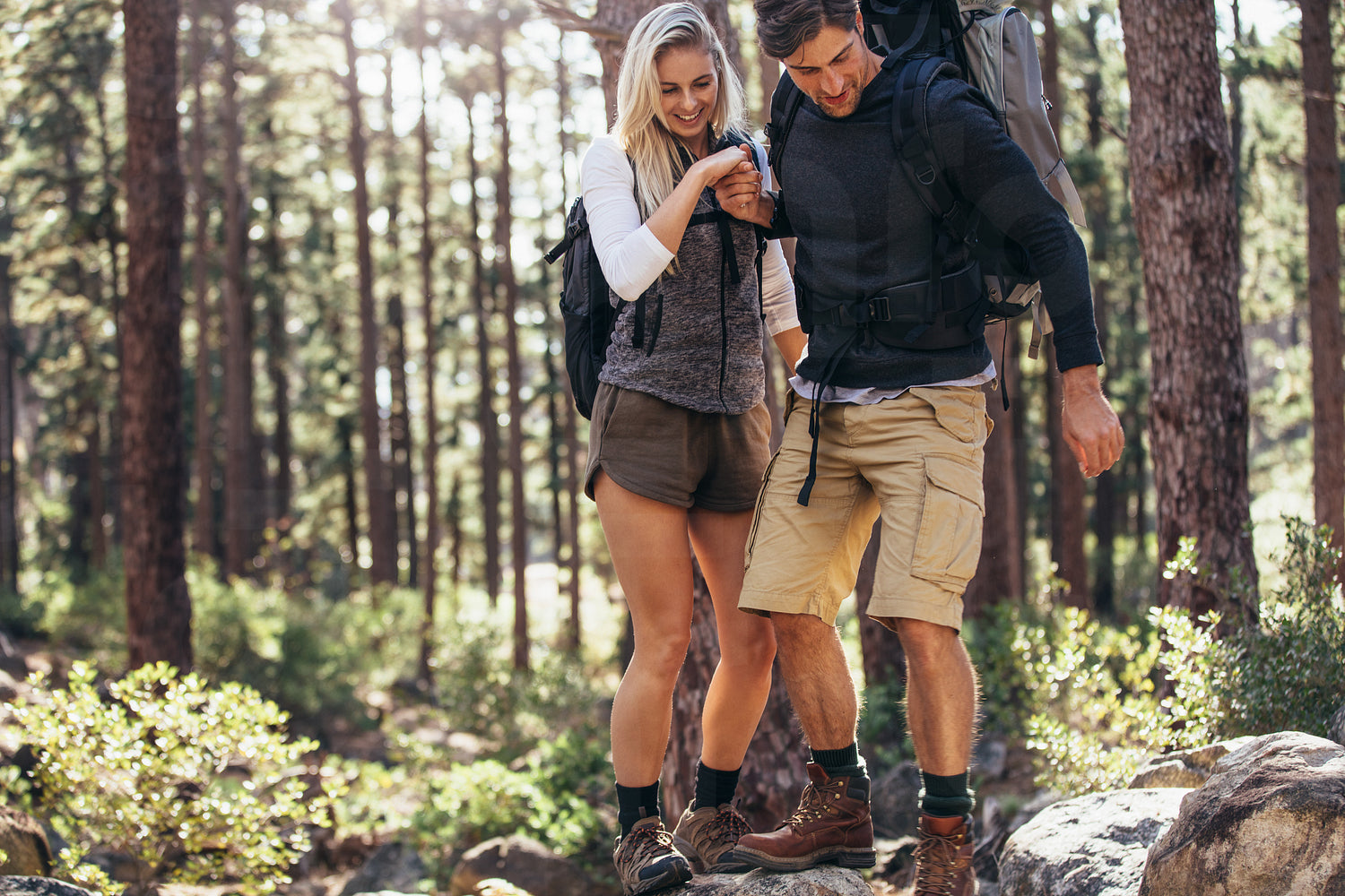 Man and woman hikers trekking a rocky path in forest. Hiker couple hold hands and walk carefully on rocks in forest.