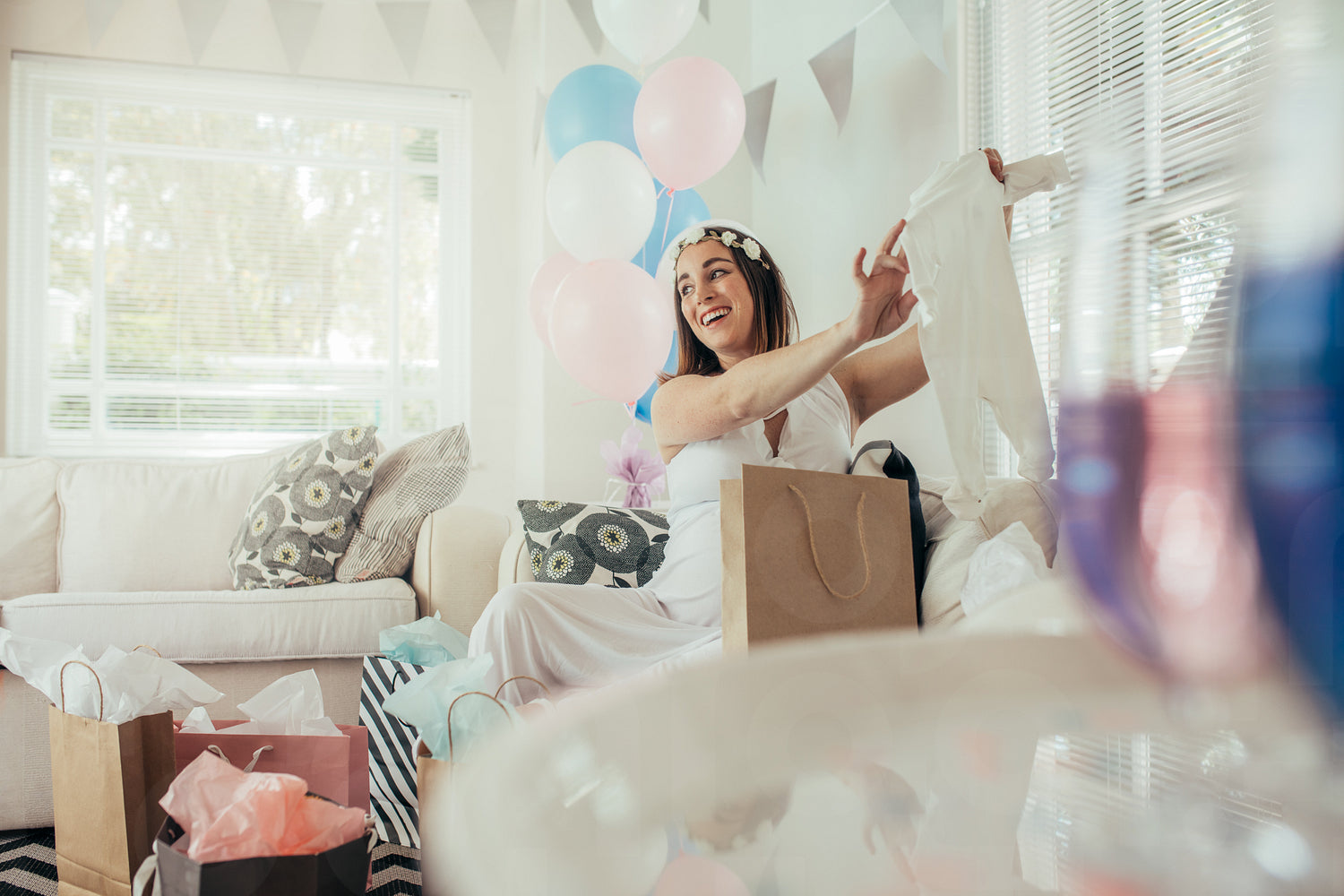 Smiling young pregnant woman receiving gifts from her friends. Female opening presents received at baby shower party.