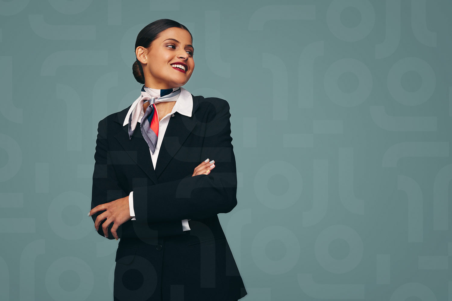 Cheerful stewardess smiling happily while standing in a studio with her arms crossed. Friendly flight attendant wearing her uniform against a studio background.