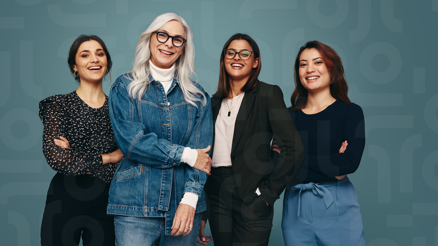 Multiethnic group of women smiling at the camera with confidence. Four women of different ages standing together against a studio background. Strong independent women embracing empowerment.