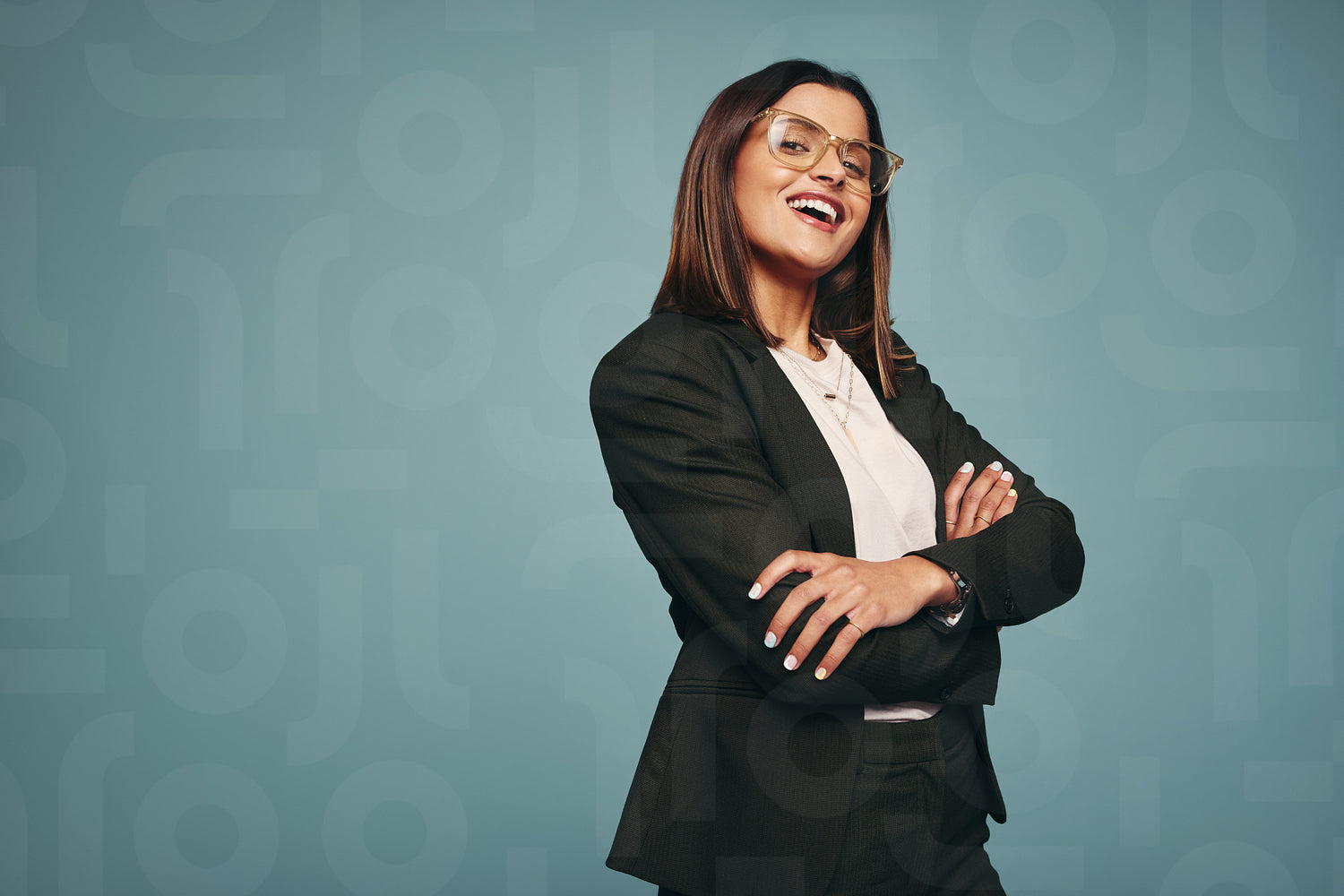 Smiling young woman standing with her arms crossed. Happy young woman looking at the camera confidently while standing against a studio background. Young woman feeling empowered in a studio.