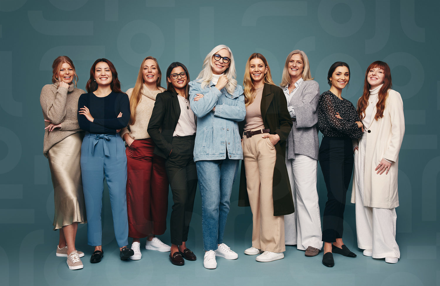 Women smiling cheerfully in a studio. Group of strong independent women looking at the camera while standing together against a studio background. Women embracing girl power.