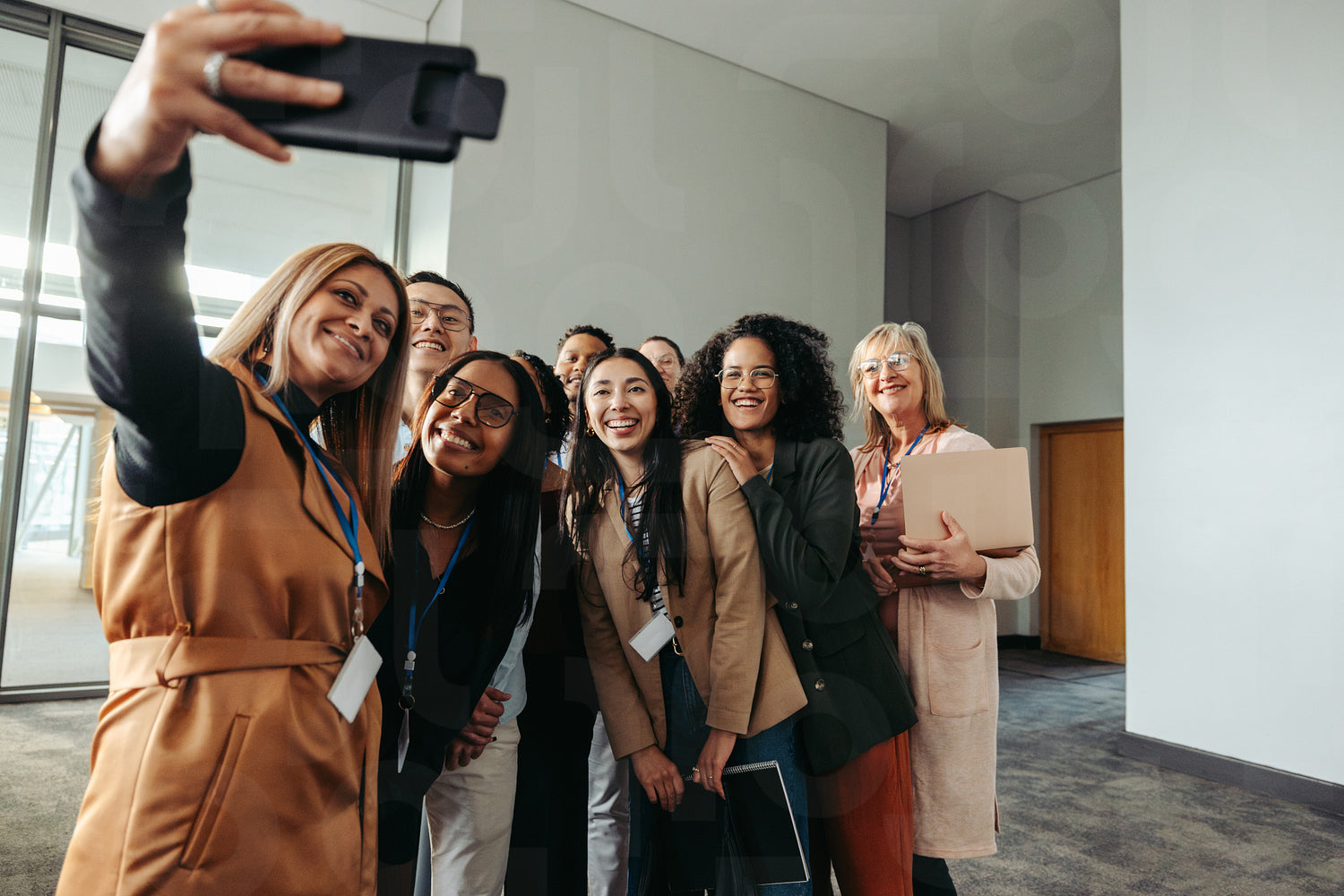 Business people taking a joyful selfie together at a networking event, showcasing teamwork and connection in a professional setting.