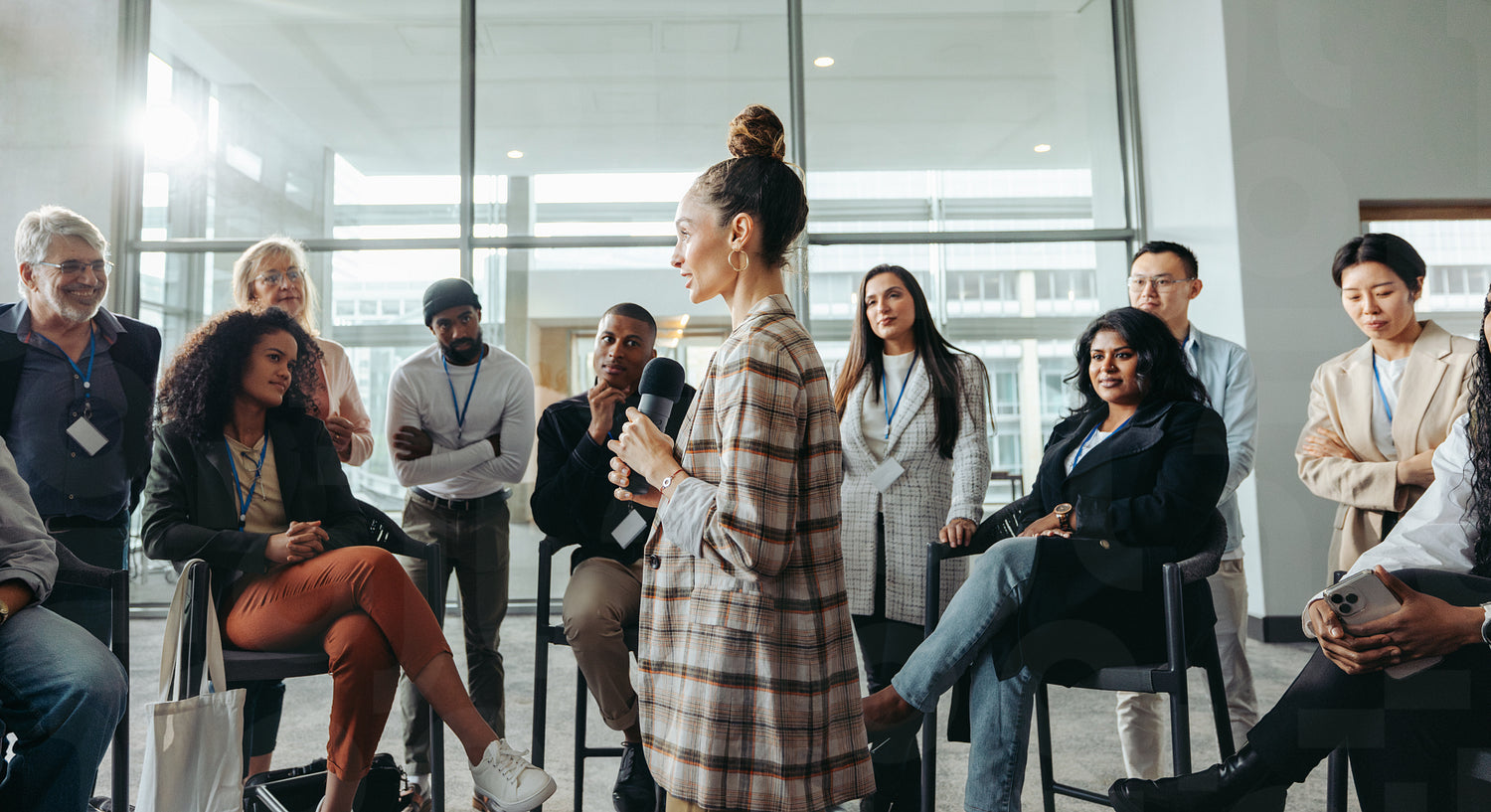 Confident businesswoman leading a discussion with diverse colleagues in a modern office setting, showcasing leadership and collaboration.