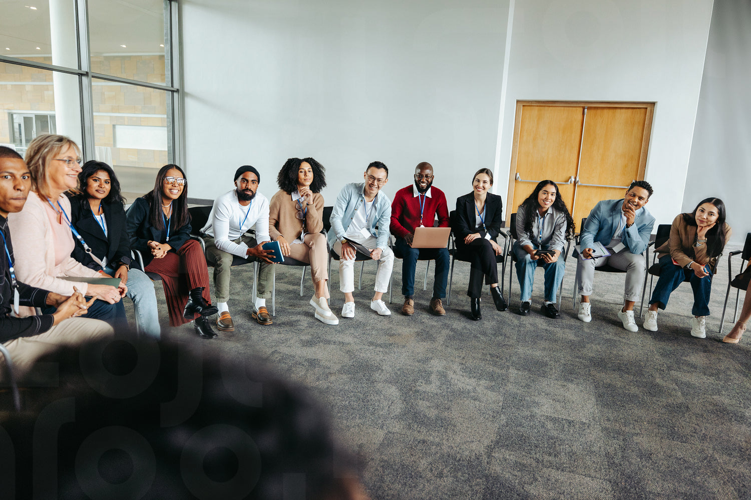 A diverse group of professionals seated in a circle engaged in a collaborative discussion, promoting teamwork and communication in a modern office setting.
