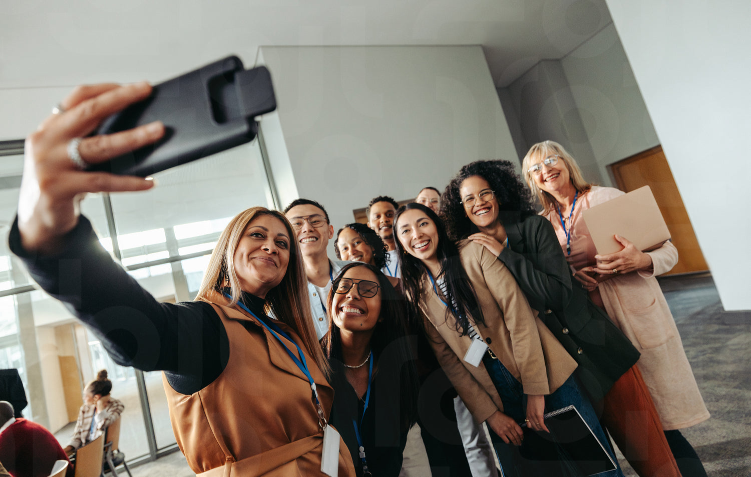 Diverse group of professionals taking a selfie at a business conference, creating new connections and fostering collaboration in an inspiring corporate environment