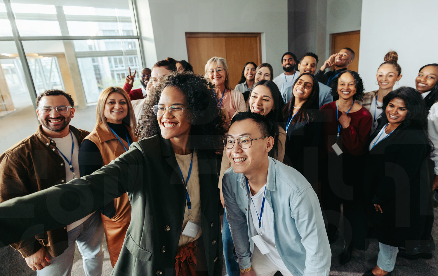 Diverse group of professionals taking a selfie at a successful conference, showcasing teamwork and unity during a training session
