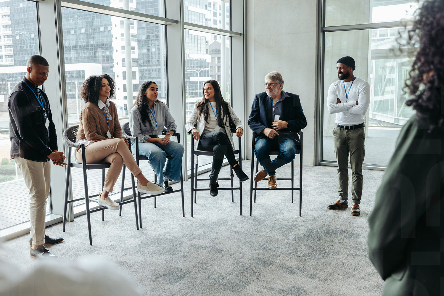 Diverse professionals engaging in a panel discussion at a corporate event, sharing insights and expertise in a modern conference room setting.