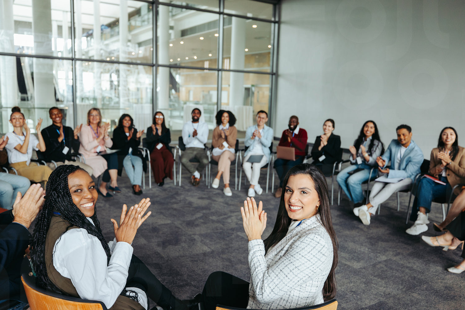 Group clapping at a successful presentation in a modern office setting
