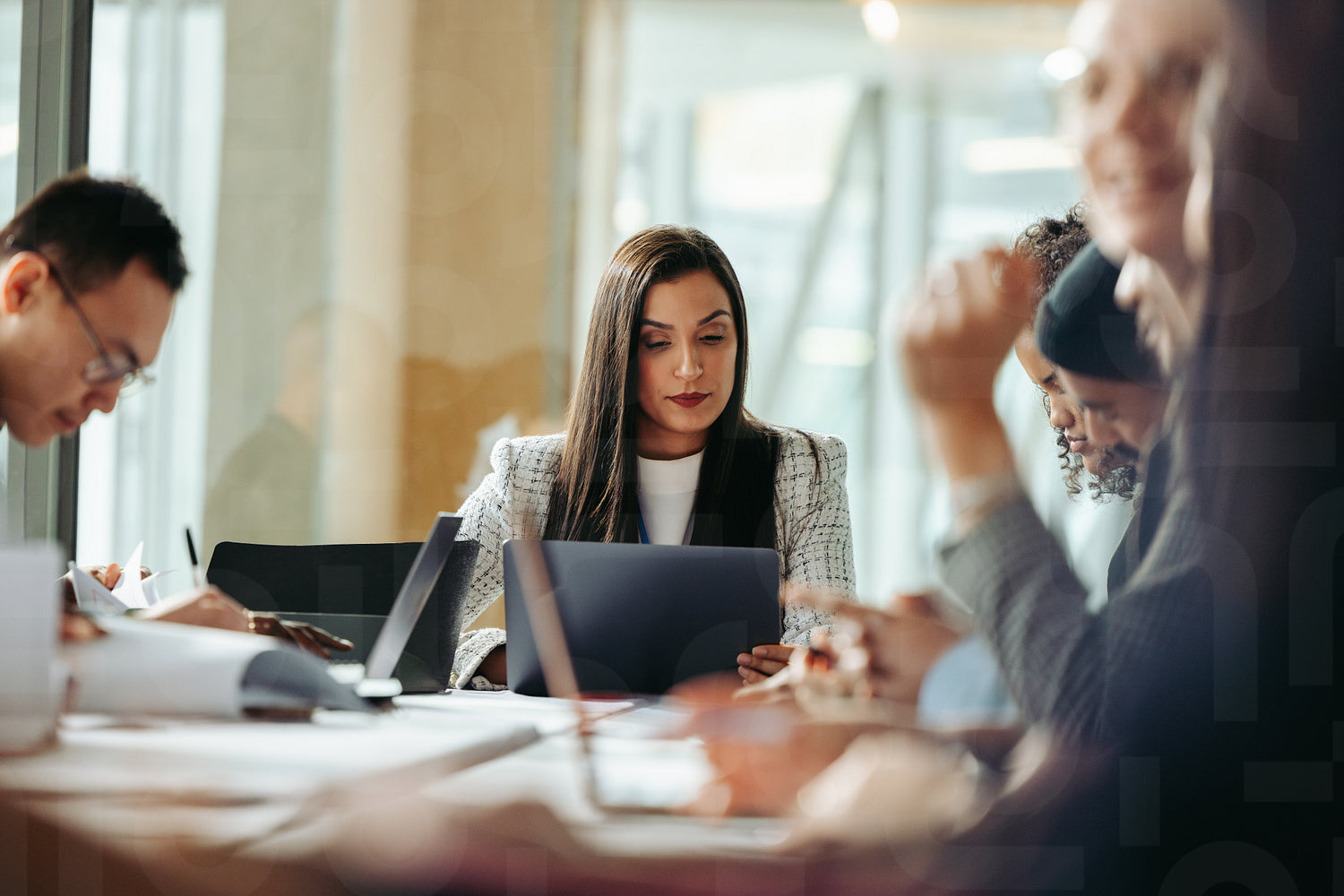 Professionals collaborating in a business meeting, emphasizing teamwork, communication, and focus in a modern office environment.