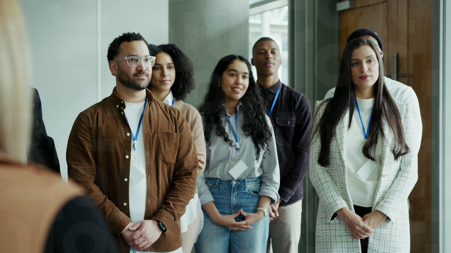 Diverse conference attendees wearing lanyards stand attentively, then begin to clap enthusiastically, showing their collective appreciation and positive engagement at a professional event.