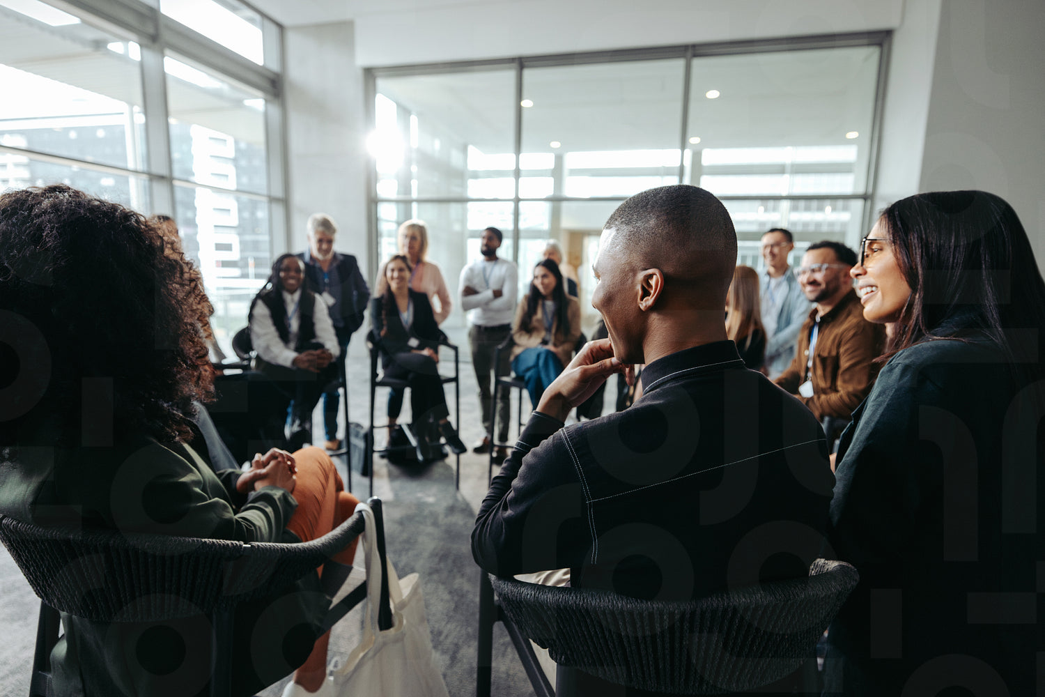 Multiethnic employees participating in an interactive workshop within a modern office environment, fostering teamwork and collaboration.