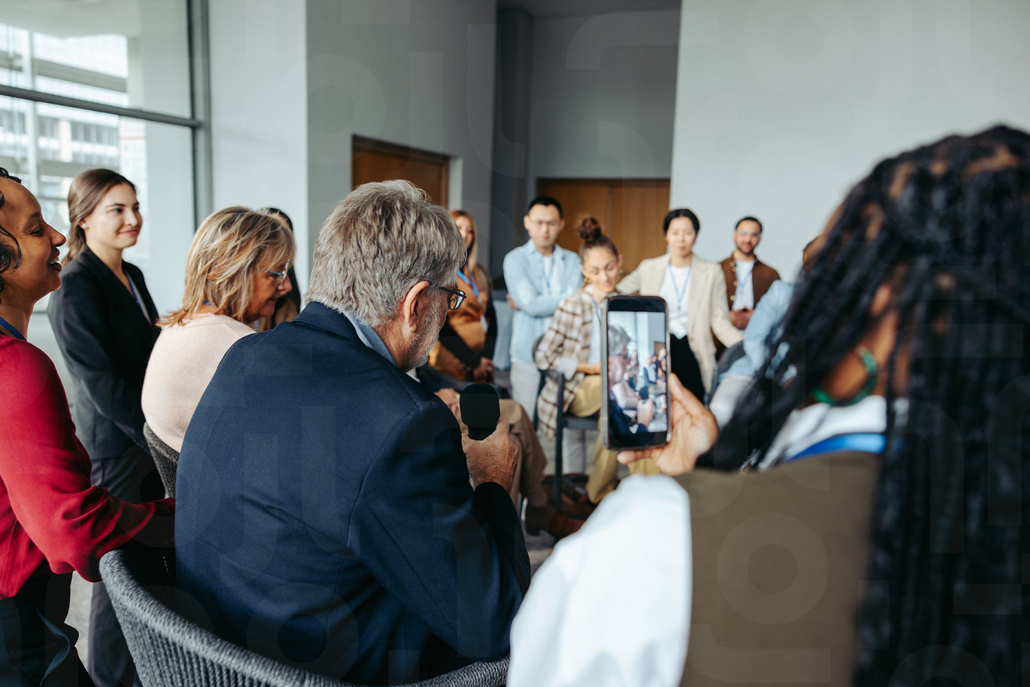Senior businessman sharing his expertise with a diverse and attentive team in a modern office setting, fostering teamwork and collaboration.