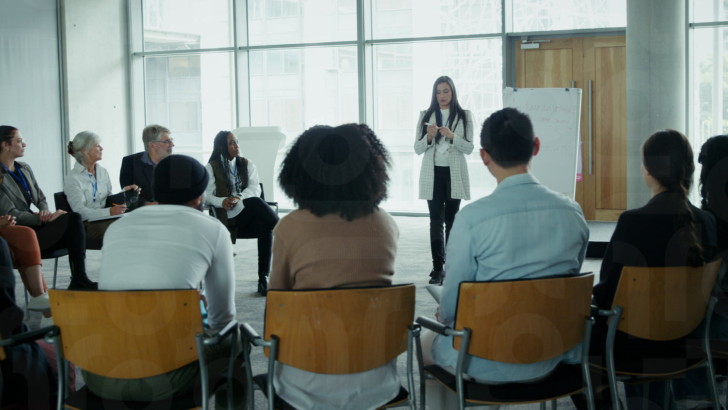 A professional speaker leads an engaged group of colleagues during a corporate training session. Attendees listen intently, fostering communication and collaboration in a business workshop setting.