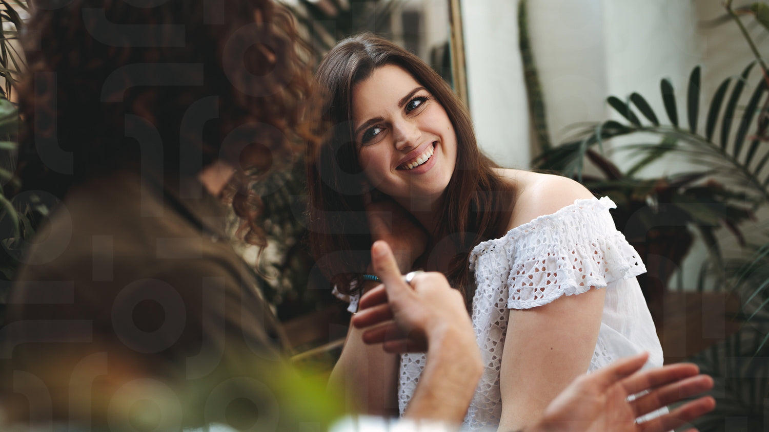 Beautiful woman listening to her boyfriend and smiling. Couple spending time together at a cafe.
