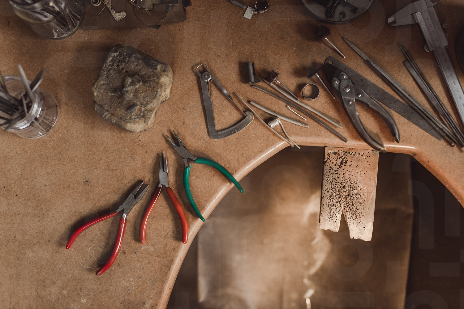 Top view jewelry maker workbench with tools on table. Equipment and tools of a goldsmith on wooden working desk inside a workshop.