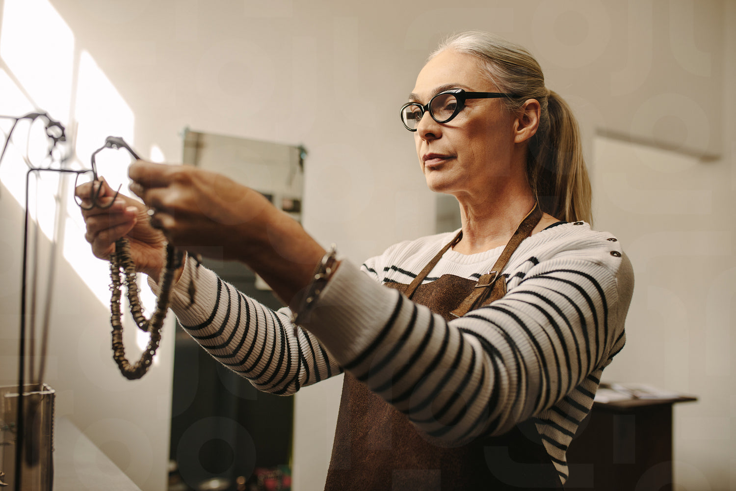 Senior jewelry maker hanging a necklace on stand. Mature female goldsmith working at her workshop.