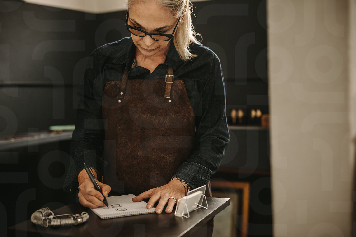 Senior woman jewelry designer making new ring design for client on paper. Experienced jewelry maker making ring sketch on book. Jewelry designer sketching out designs in studio