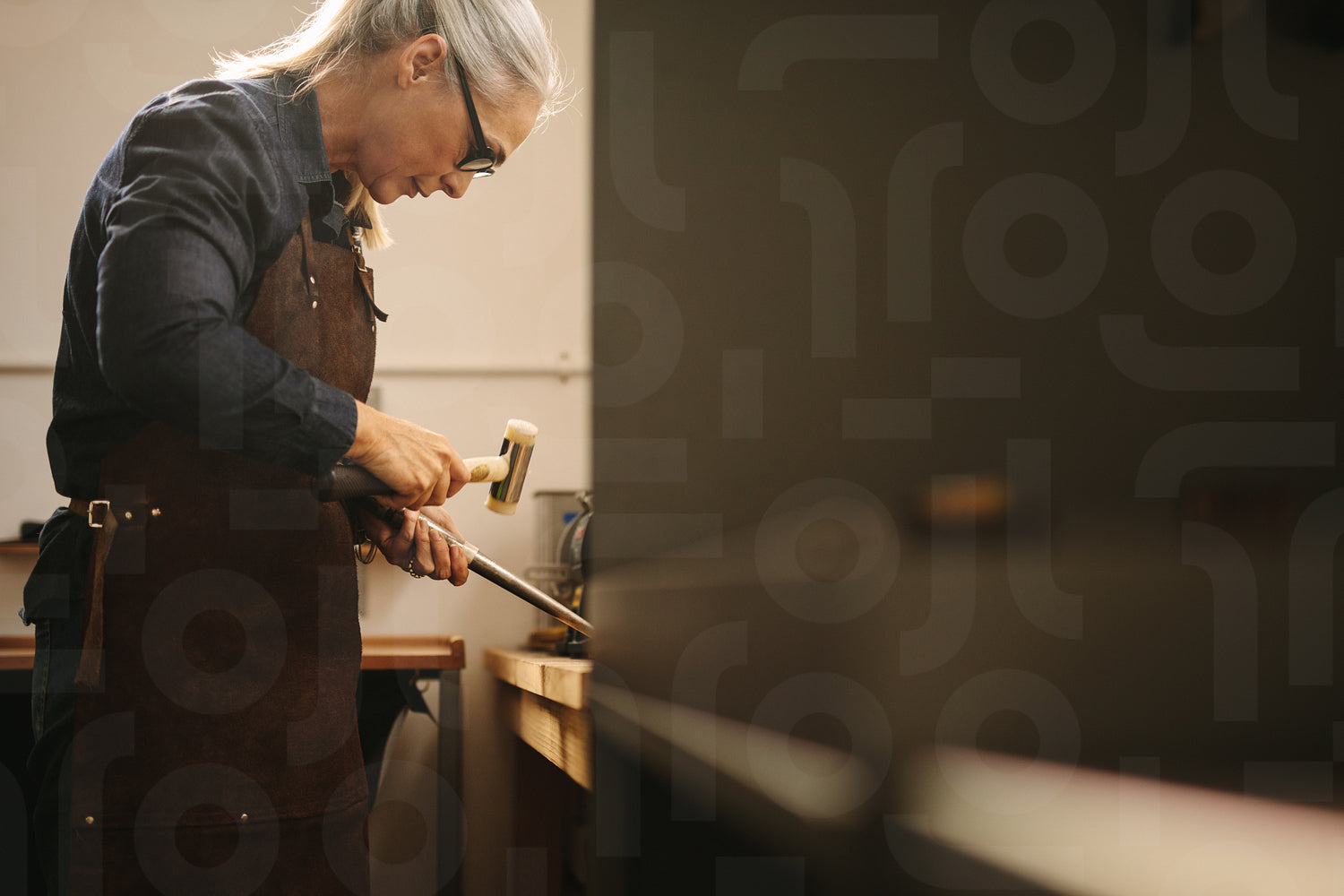Senior woman making jewelry using traditional tools in her workshop. Female goldsmith wearing leather apron and glasses making a ring at a workbench using hammer and steel sizing tool.