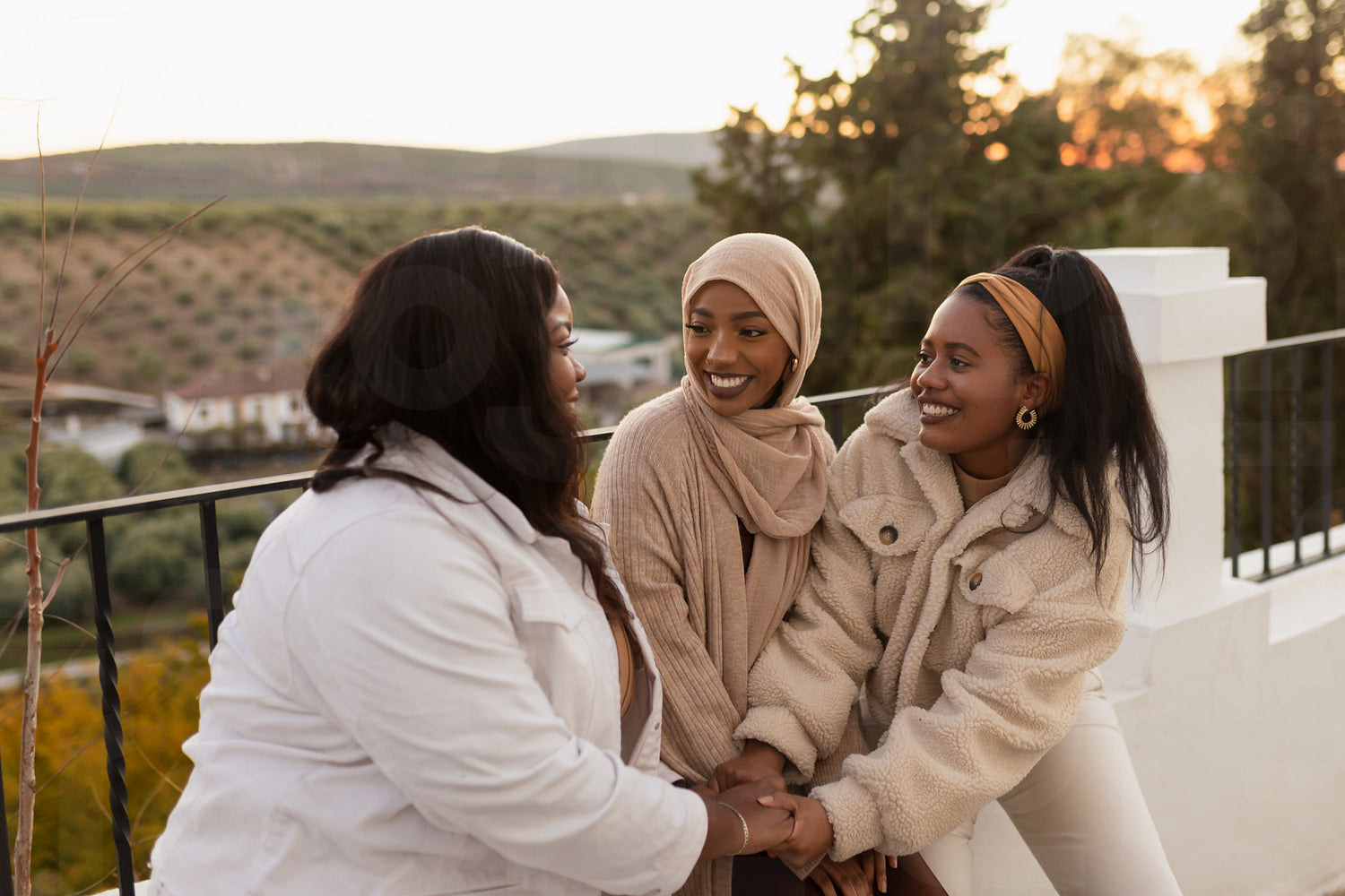 Female friends holding hands together outdoors. Three happy friends sharing an affectionate moment while leaning on a bridge. Group of multicultural friends hanging out together on the weekend.