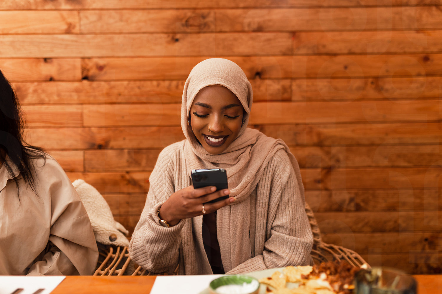 Muslim woman scrolling her smartphone in a restaurant