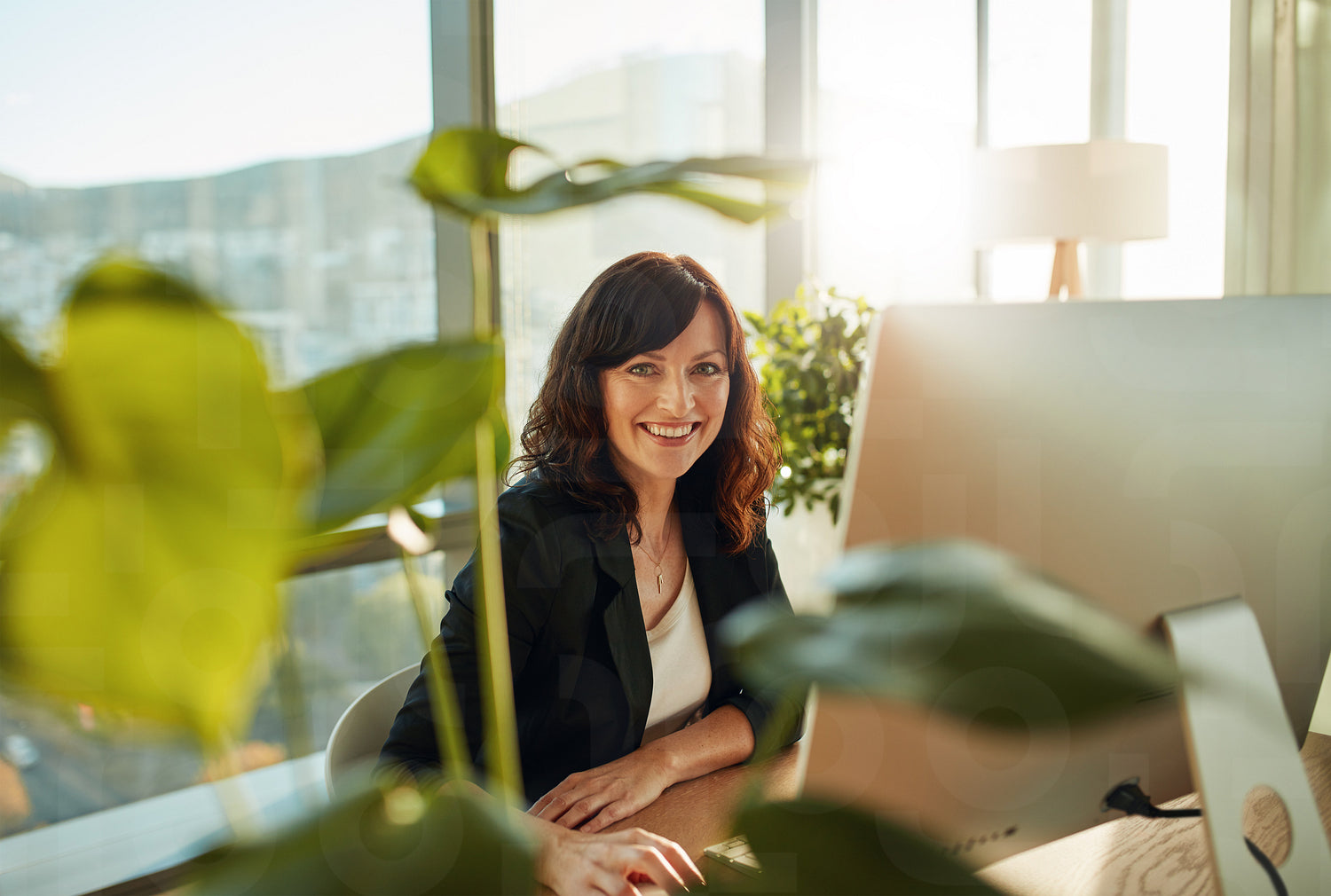 Portrait of beautiful young businesswoman sitting at her desk with desktop computer looking at camera and smiling. Caucasian female designer at her workplace.