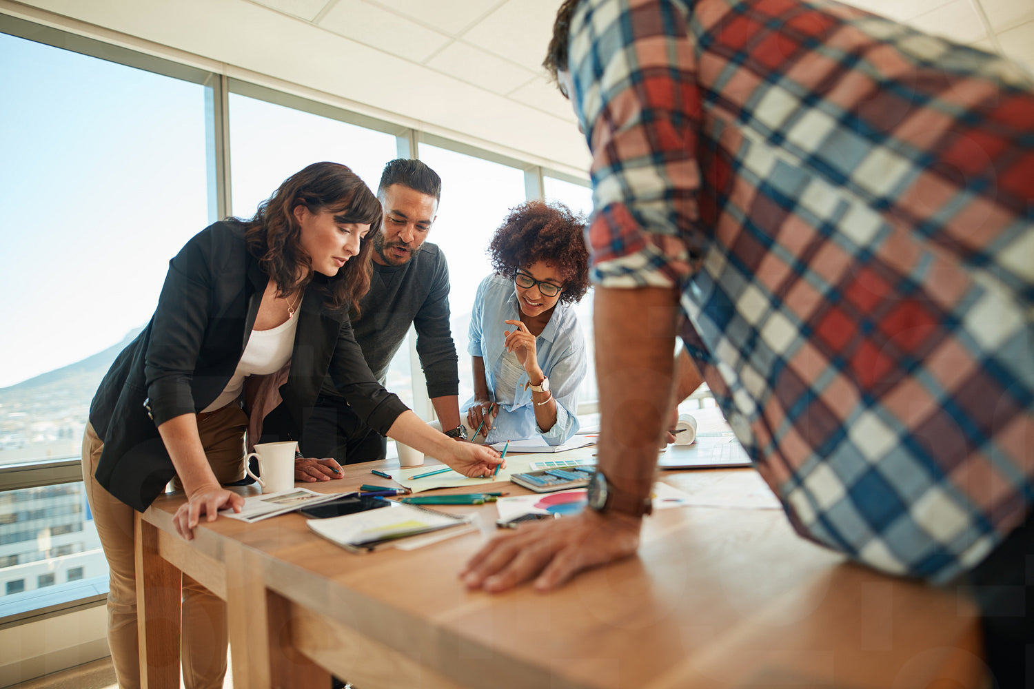 Team of creative professionals working together in office. Group of young man and woman working on new business project in office.